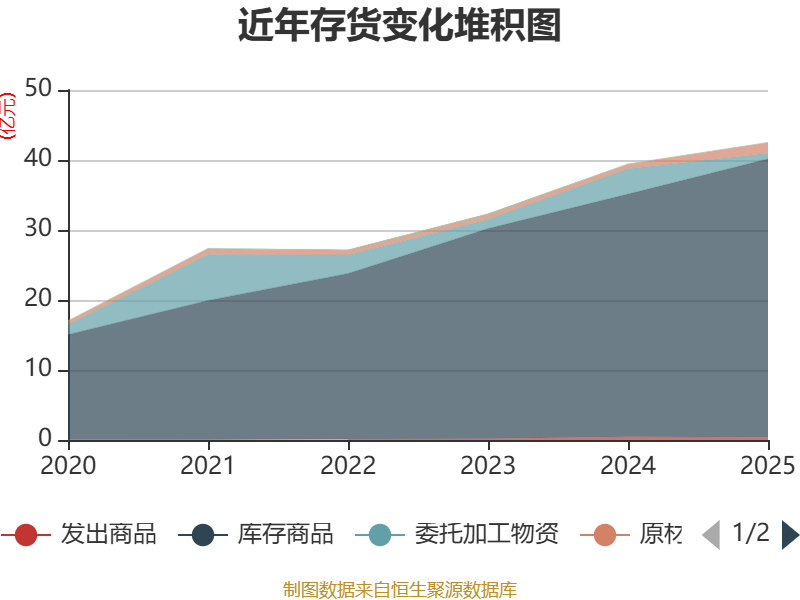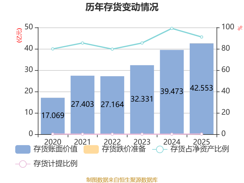 从存货变动来看,截至2025年末,公司存货账面价值为42.55亿元,占净资产的91.06%,较上年末增加3.08亿元。其中,存货跌价准备为618.72万元,计提比例为0.15%。