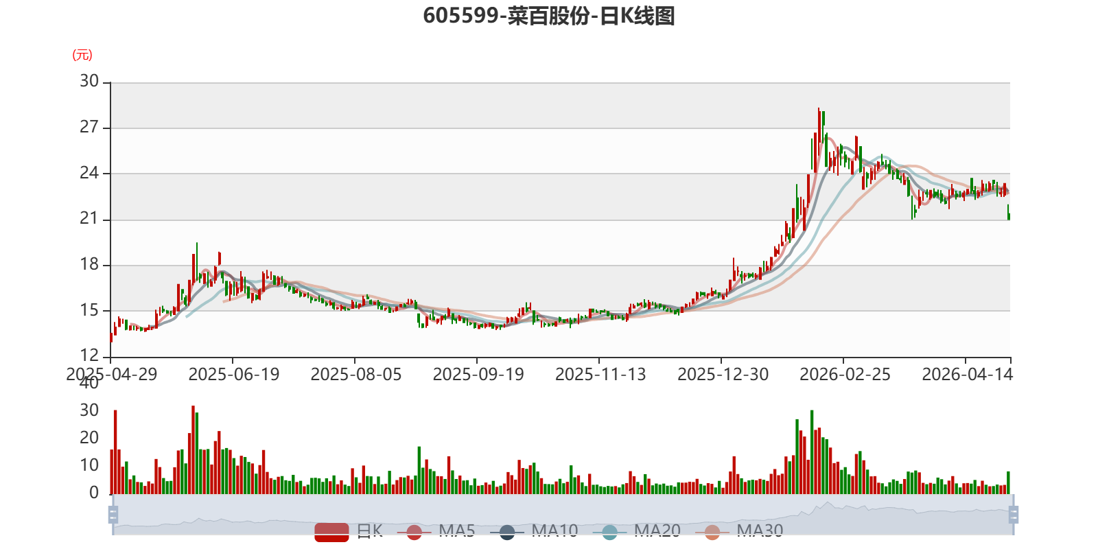 以4月28日收盘价计算,菜百股份目前市盈率(TTM)约为16.03倍,市净率(LF)约3.89倍,市销率(TTM)约0.63倍。