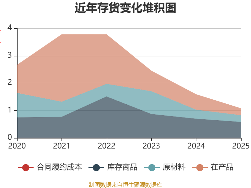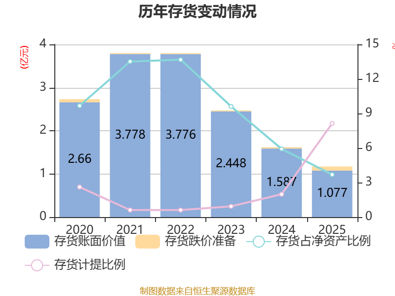从存货变动来看,截至2025年末,公司存货账面价值为1.08亿元,占净资产的3.69%,较上年末减少5104.73万元。其中,存货跌价准备为952.59万元,计提比例为8.13%。