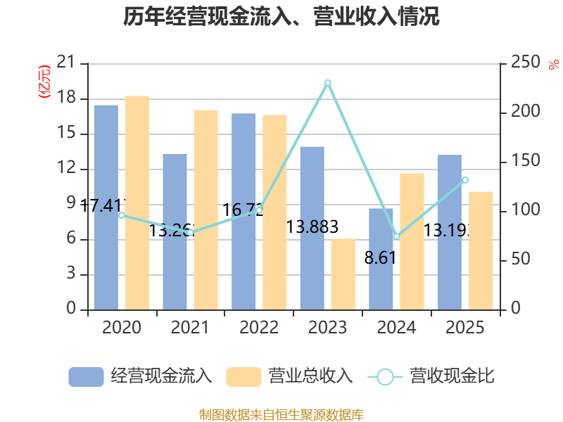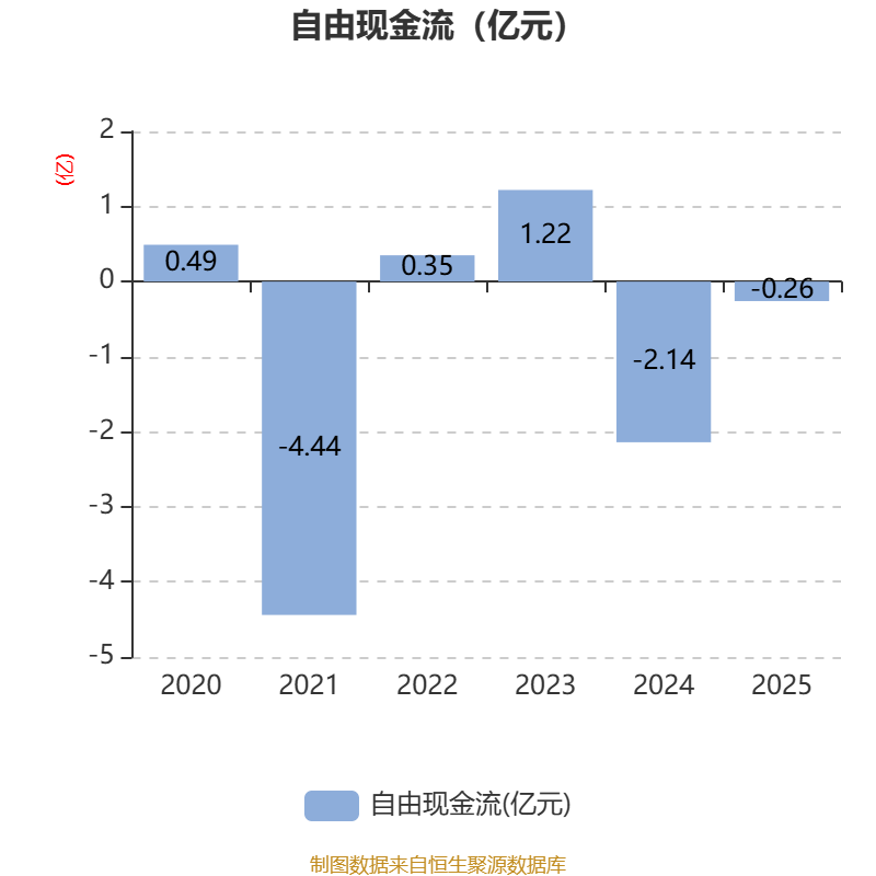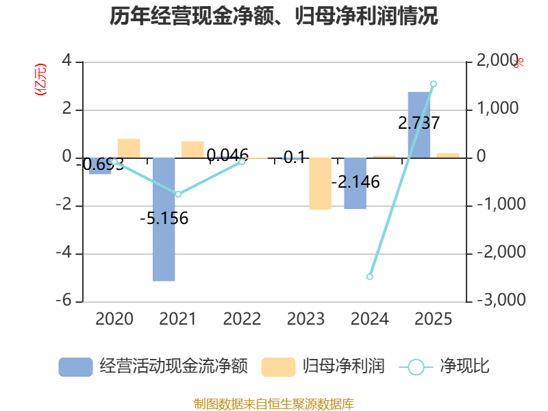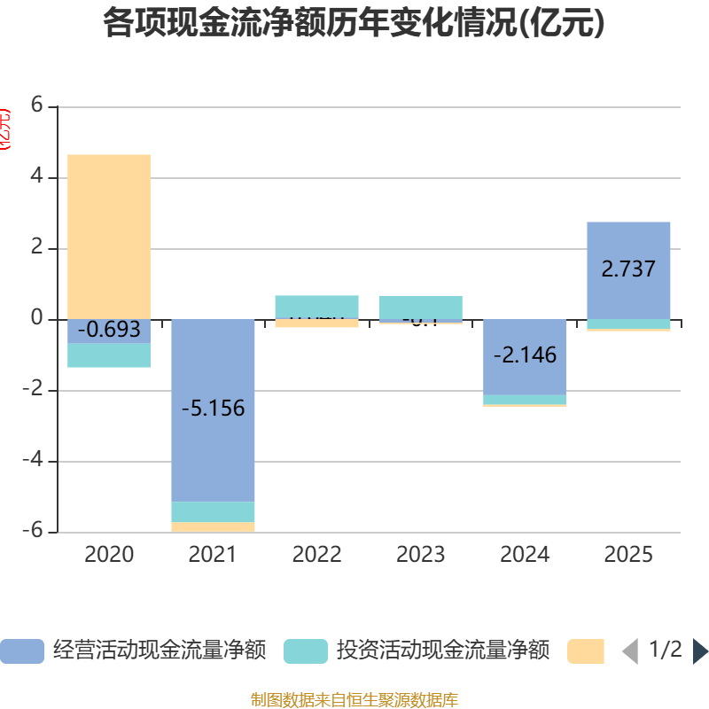 截至2025年,公司经营活动现金流净额为2.74亿元,同比增加4.88亿元;筹资活动现金流净额-621.35万元,同比减少53.48万元;投资活动现金流净额-2807万元,上年同期为-2705.48万元。