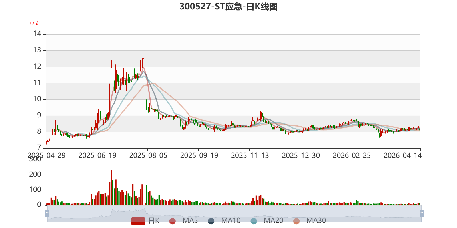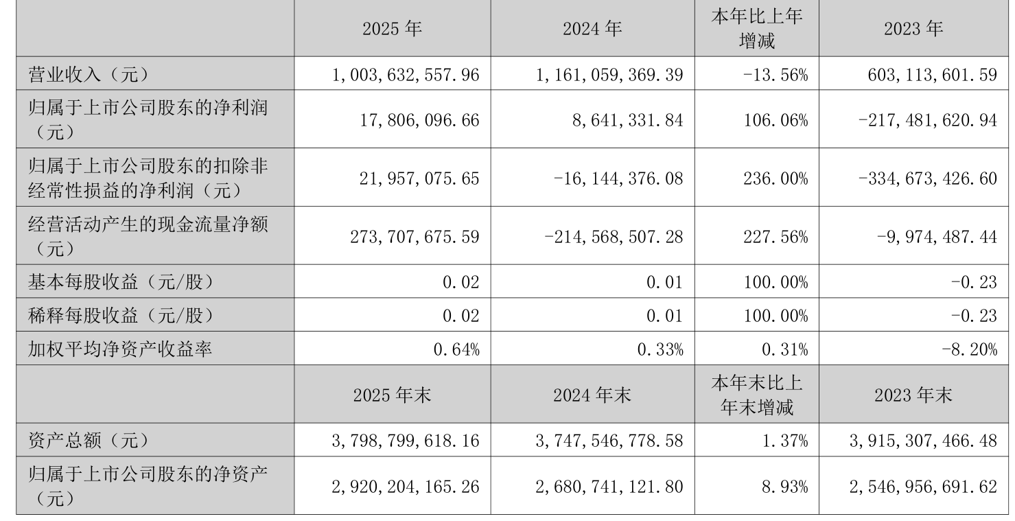 中证智能财讯 ST应急(300527)4月29日披露2025年年度报告。2025年,公司实现营业总收入10.04亿元,同比下降13.56%;归母净利润1780.61万元,同比增长106.06%;扣非净利润2195.71万元,同比扭亏;经营活动产生的现金流量净额为2.74亿元,上年同期为-2.15亿元;报告期内,ST应急基本每股收益为0.02元,加权平均净资产收益率为0.64%。公司2025年度分配预案为:拟向全体股东每10股派现0.0526元(含税)。