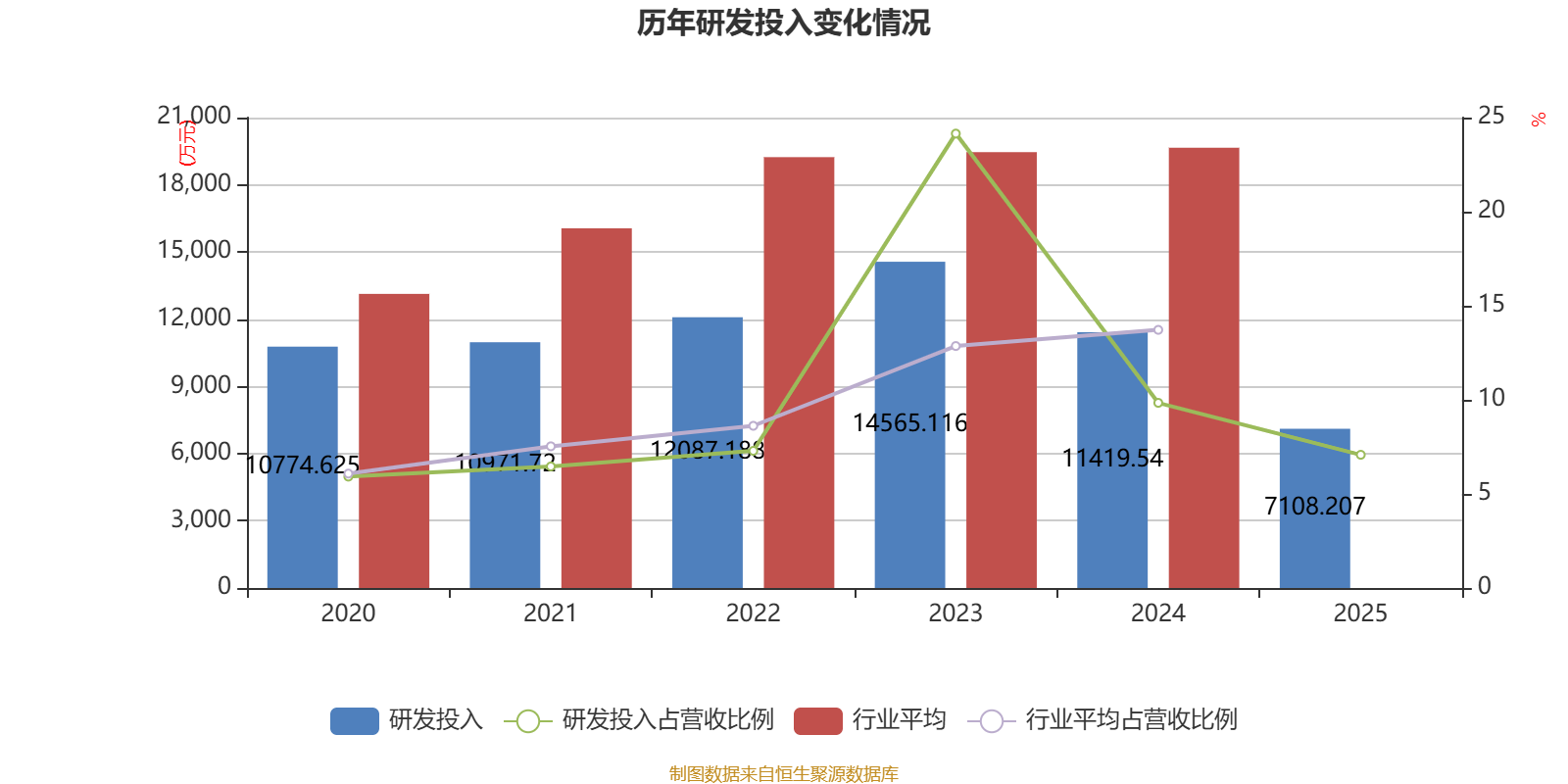 2025年全年,公司研发投入金额为7108.21万元,同比下降37.75%;研发投入占营业收入比例为7.08%,相比上年同期下降2.76个百分点。此外,公司全年研发投入资本化率为0%。