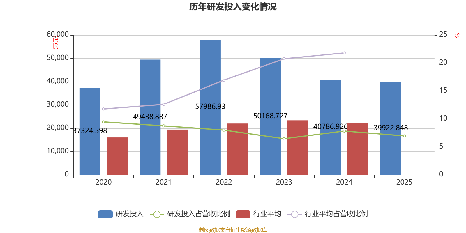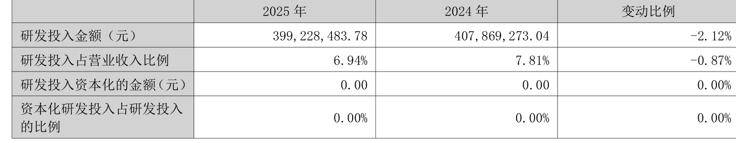 2025年全年,公司研发投入金额为3.99亿元,同比下降2.12%;研发投入占营业收入比例为6.94%,相比上年同期下降0.87个百分点。此外,公司全年研发投入资本化率为0%。
