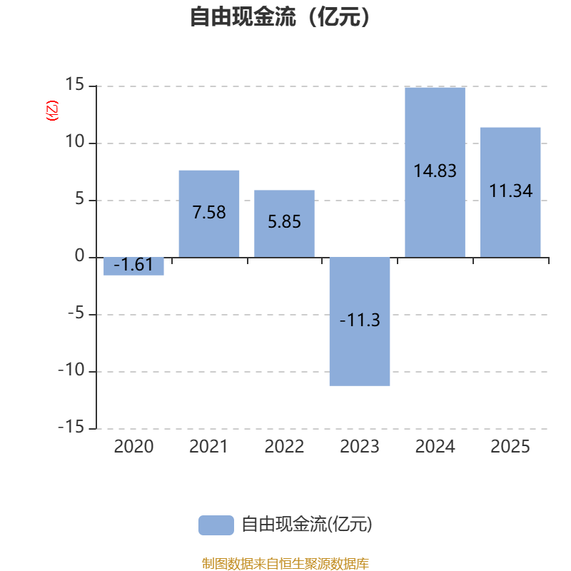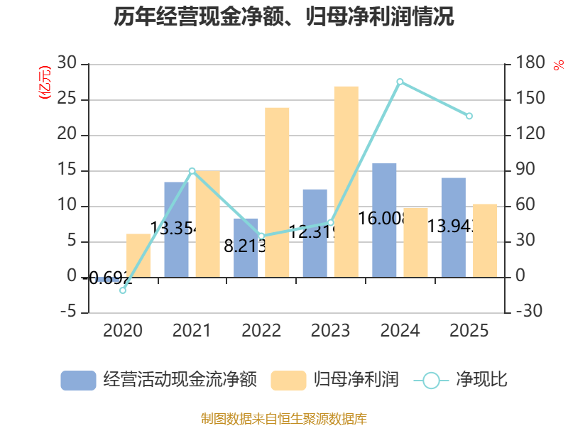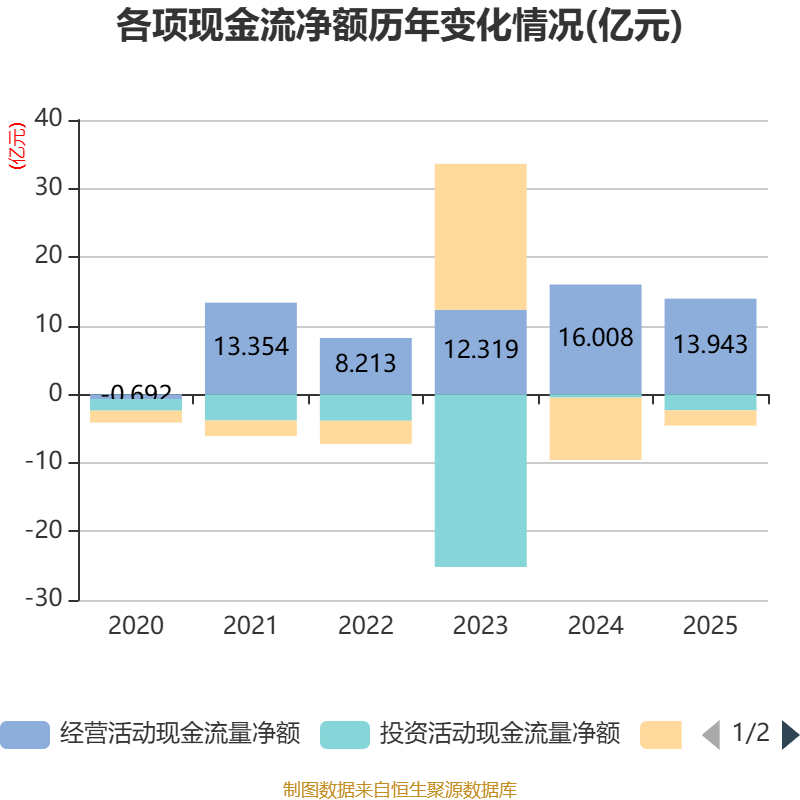 截至2025年,公司经营活动现金流净额为13.94亿元,同比下降12.9%;筹资活动现金流净额-2.23亿元,同比增加6.85亿元;投资活动现金流净额-2.34亿元,上年同期为-4917.94万元。