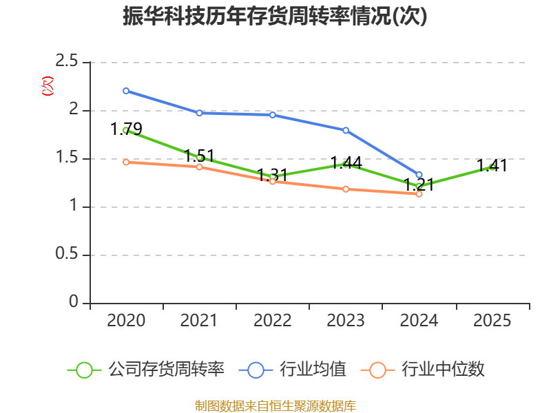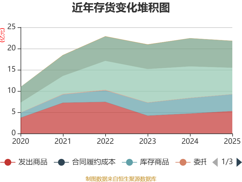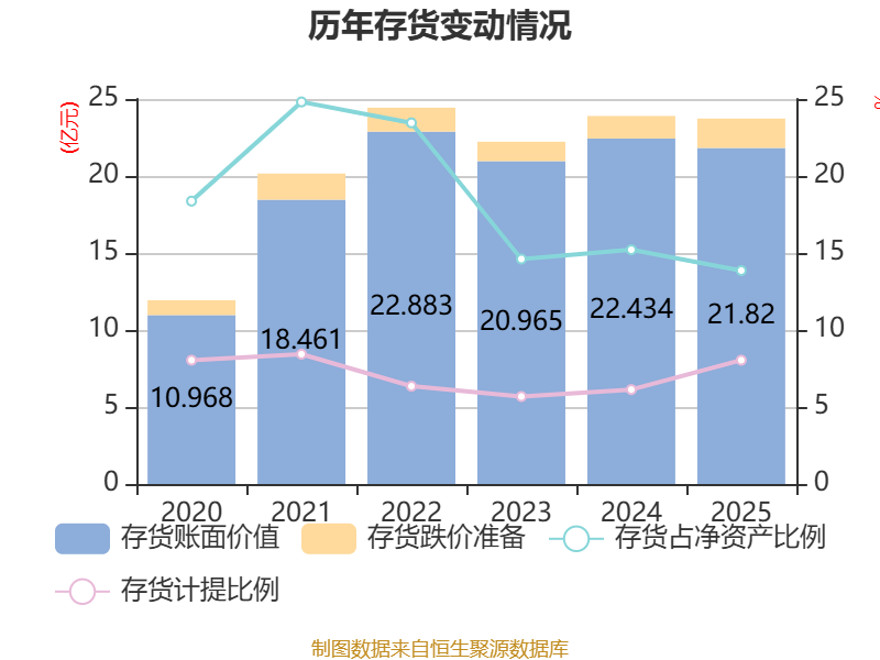 从存货变动来看,截至2025年末,公司存货账面价值为21.82亿元,占净资产的13.86%,较上年末减少6142.4万元。其中,存货跌价准备为1.91亿元,计提比例为8.04%。