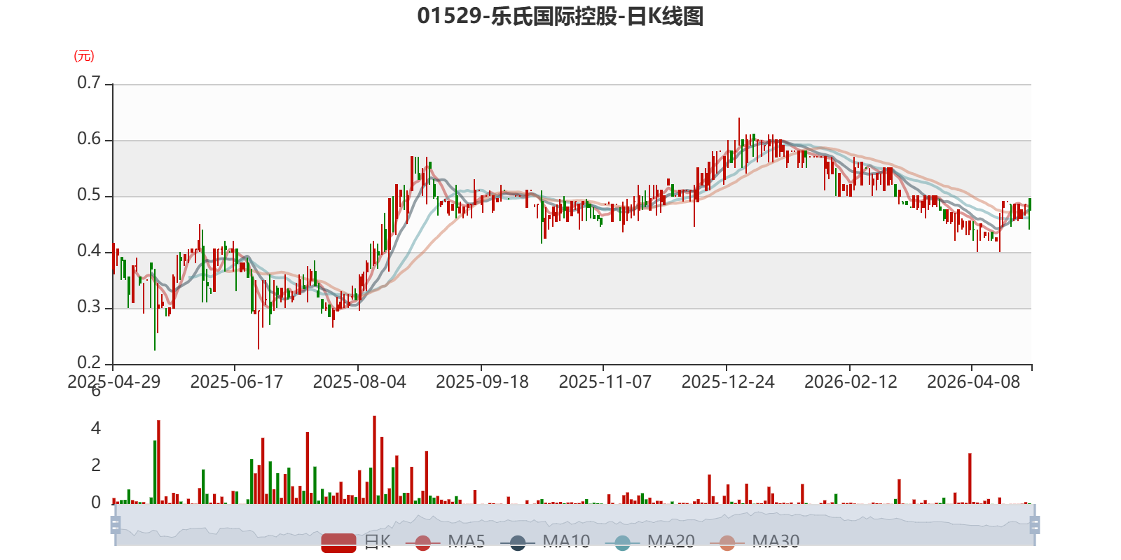 以4月29日收盘价计算,乐氏国际控股目前市净率(TTM)约1.7倍,市销率(TTM)约0.83倍。