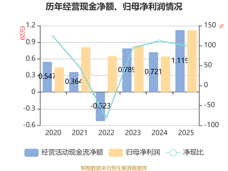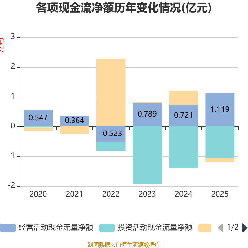 截至2025年,公司经营活动现金流净额为1.12亿元,同比增长55.32%;筹资活动现金流净额-1177.23万元,同比减少6055.35万元;投资活动现金流净额-1.07亿元,上年同期为-1.39亿元。
