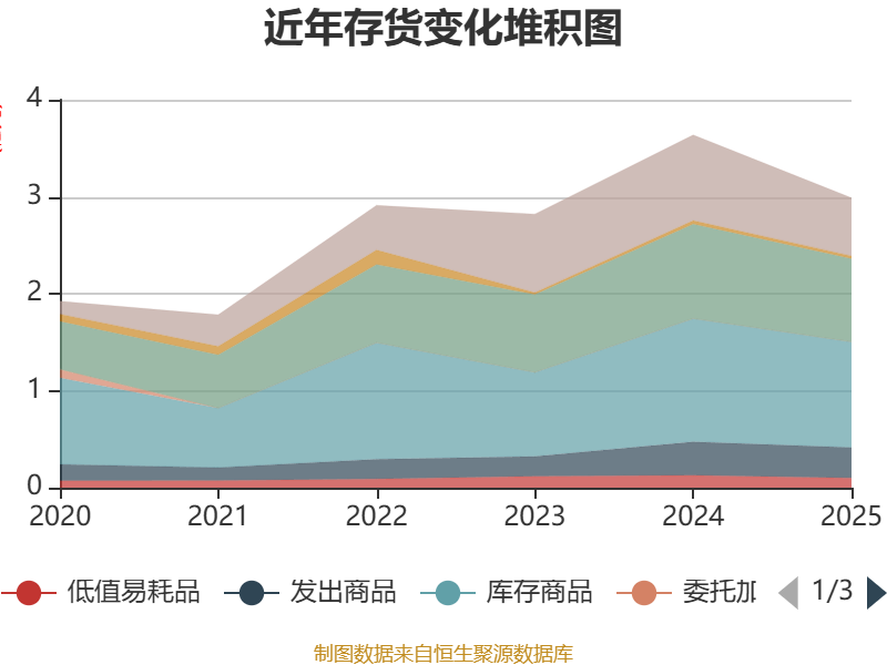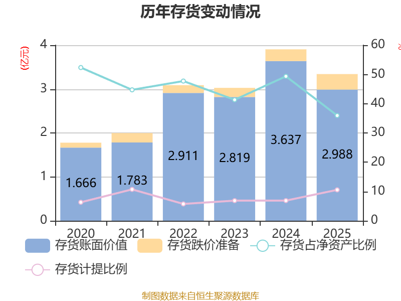 从存货变动来看,截至2025年末,公司存货账面价值为2.99亿元,占净资产的35.95%,较上年末减少6483.54万元。其中,存货跌价准备为3525.48万元,计提比例为10.55%。