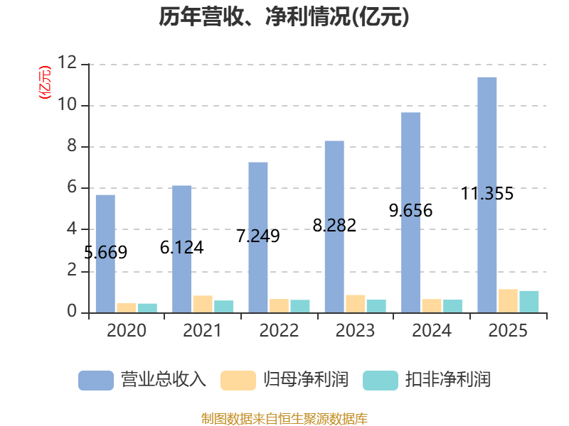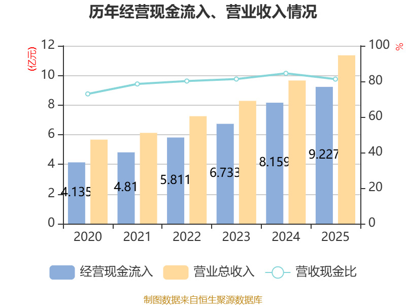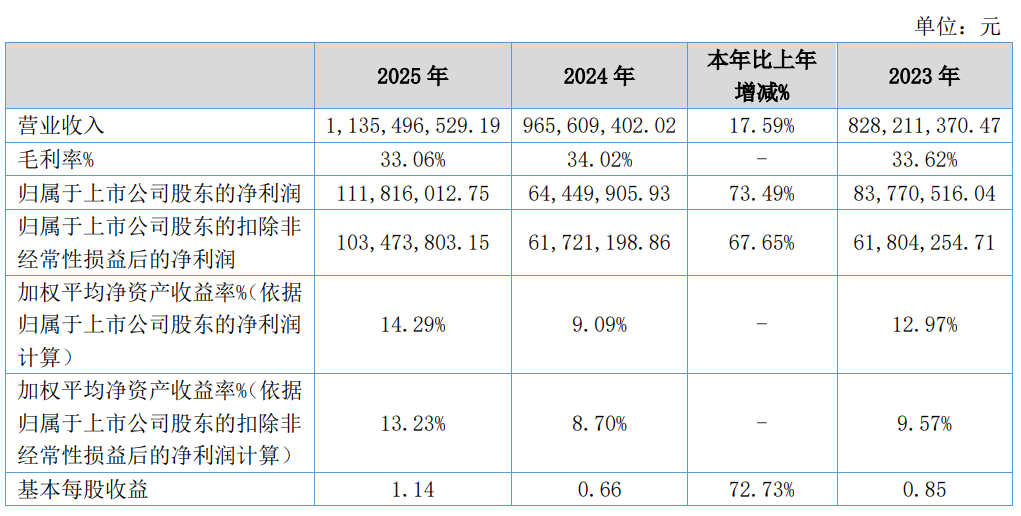 中证智能财讯三祥科技(920195)4月28日披露2025年年度报告。2025年,公司实现营业总收入11.35亿元,同比增长17.59%;归母净利润1.12亿元,同比增长73.49%;扣非净利润1.03亿元,同比增长67.65%;经营活动产生的现金流量净额为1.12亿元,同比增长55.32%;报告期内,三祥科技基本每股收益为1.14元,加权平均净资产收益率为14.29%。公司2025年度分配预案为:拟向全体股东每10股派现2元(含税)。