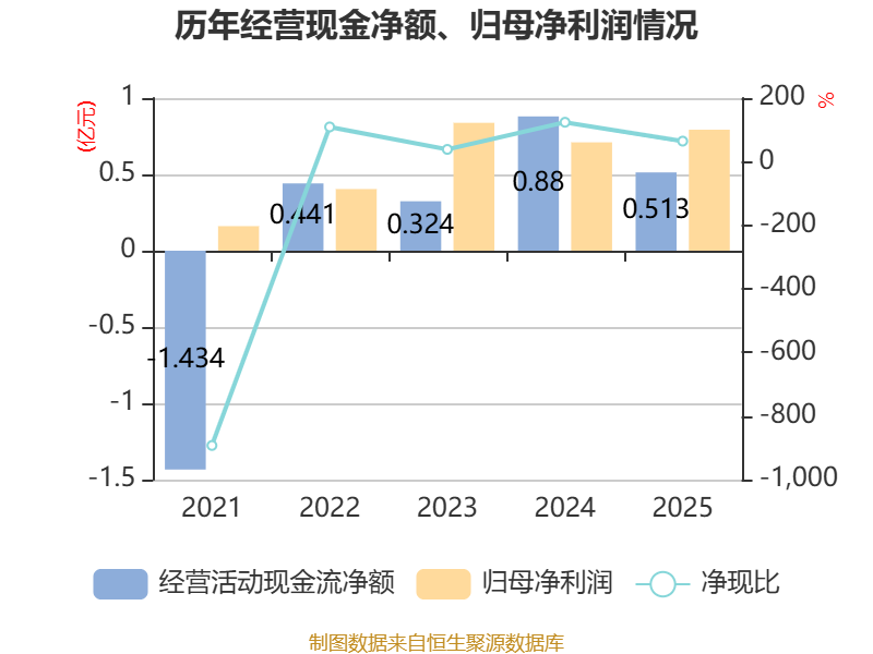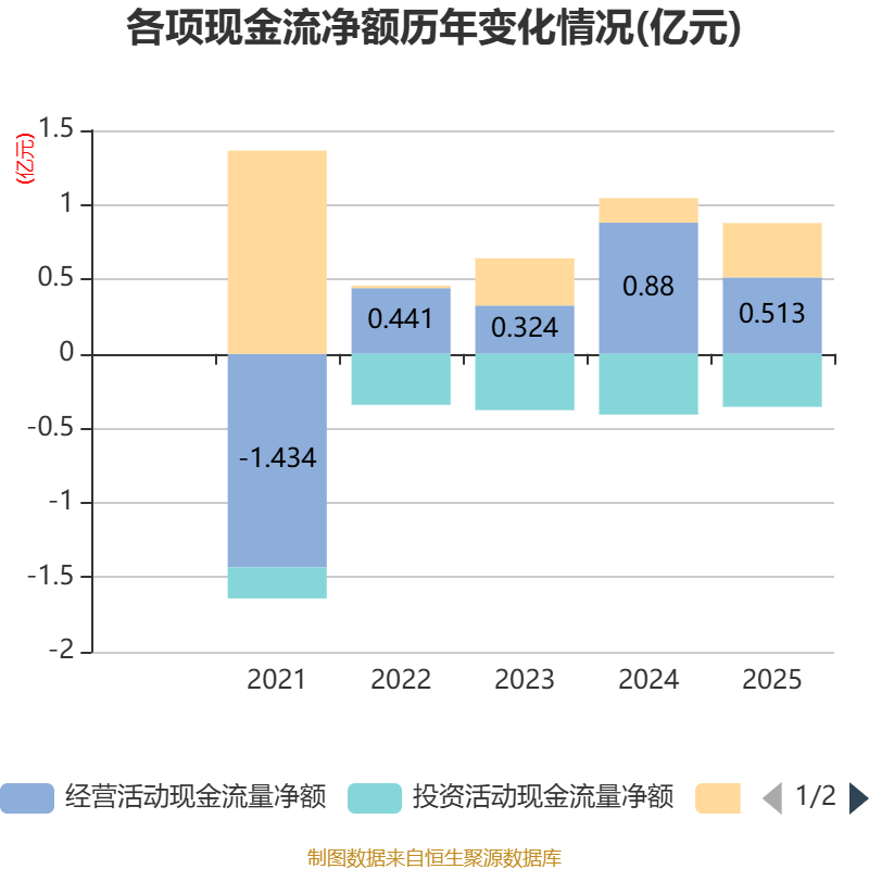 截至2025年,公司经营活动现金流净额为5126.47万元,同比下降41.75%;筹资活动现金流净额3653.28万元,同比增加2001.64万元;投资活动现金流净额-3560.83万元,上年同期为-4075.42万元。
