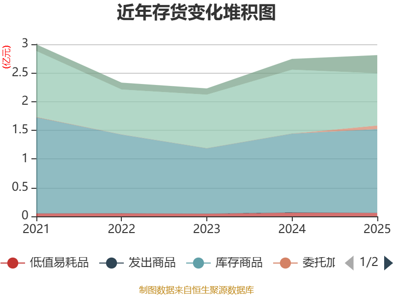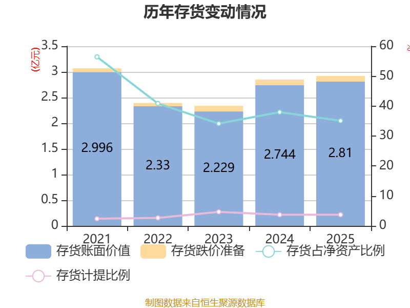从存货变动来看,截至2025年末,公司存货账面价值为2.81亿元,占净资产的35.1%,较上年末增加660.27万元。其中,存货跌价准备为1088.49万元,计提比例为3.73%。