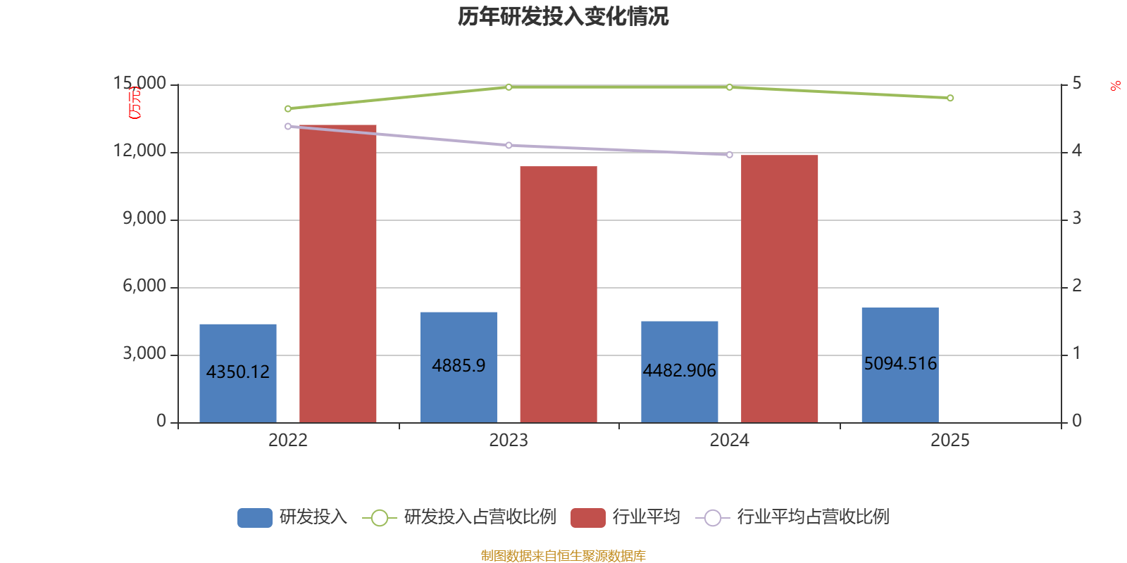 2025年全年,公司研发投入金额为5094.52万元,同比增长13.64%;研发投入占营业收入比例为4.8%,相比上年同期下降0.16个百分点。此外,公司全年研发投入资本化率为0%。