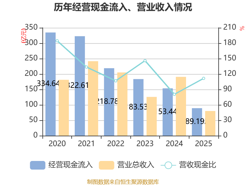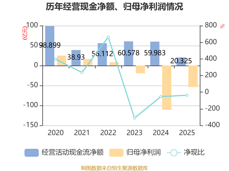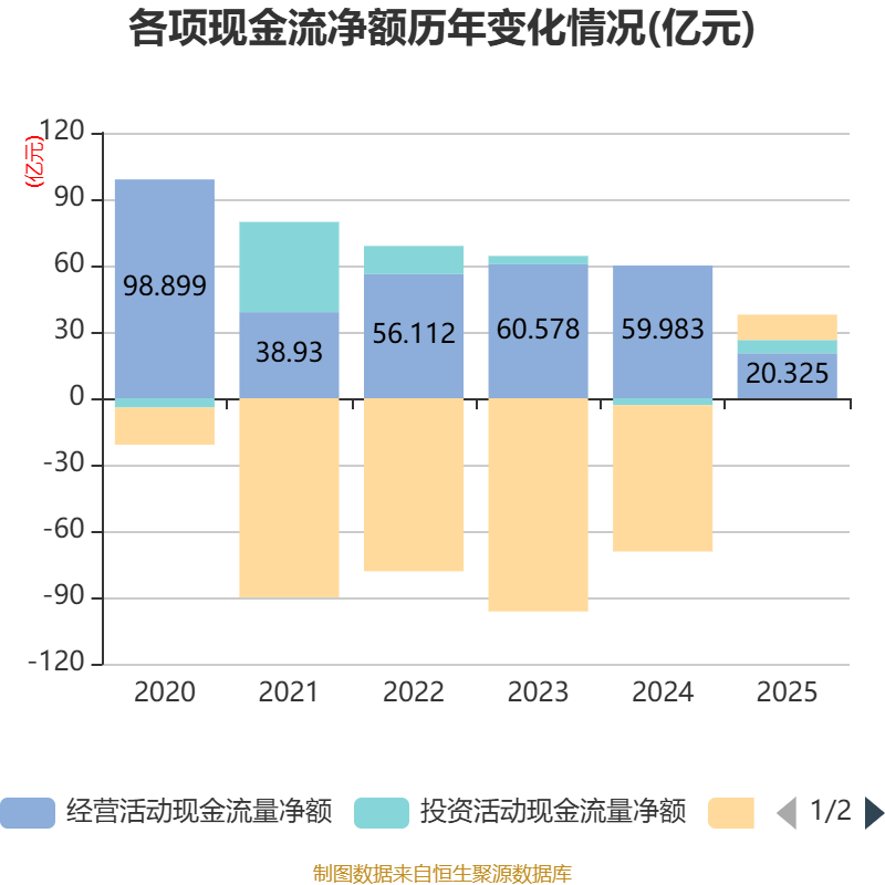 截至2025年,公司经营活动现金流净额为20.32亿元,同比下降66.12%;筹资活动现金流净额11.46亿元,同比增加77.63亿元;投资活动现金流净额6.02亿元,上年同期为-3.09亿元。