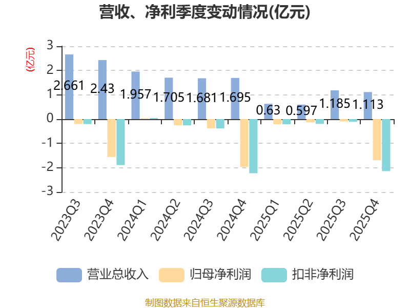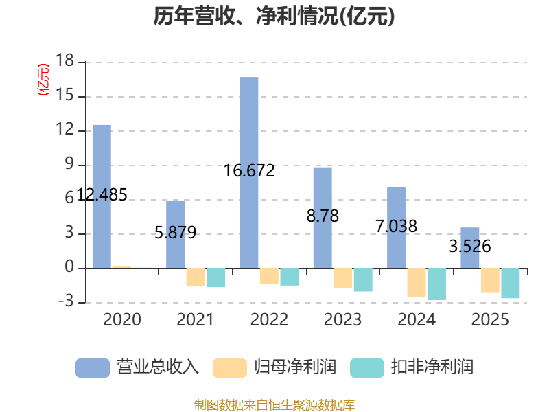 中证智能财讯美芝股份(002856)4月29日披露2025年年度报告。2025年,公司实现营业总收入3.53亿元,同比下降49.91%;归母净利润亏损2.14亿元,上年同期亏损2.57亿元;扣非净利润亏损2.65亿元,上年同期亏损2.82亿元;经营活动产生的现金流量净额为-1.21亿元,上年同期为-4848.34万元;报告期内,美芝股份基本每股收益为-1.58元。
