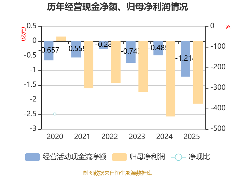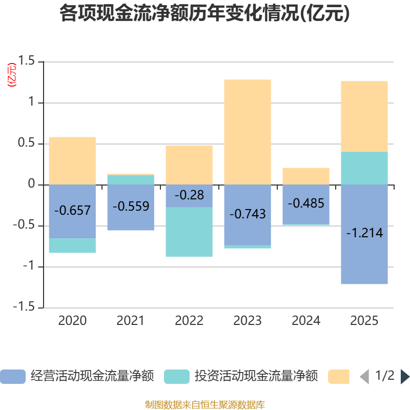 截至2025年,公司经营活动现金流净额为-1.21亿元,同比减少7293.63万元;筹资活动现金流净额8617.5万元,同比增加6599.52万元;投资活动现金流净额3989.36万元,上年同期为-108.75万元。
