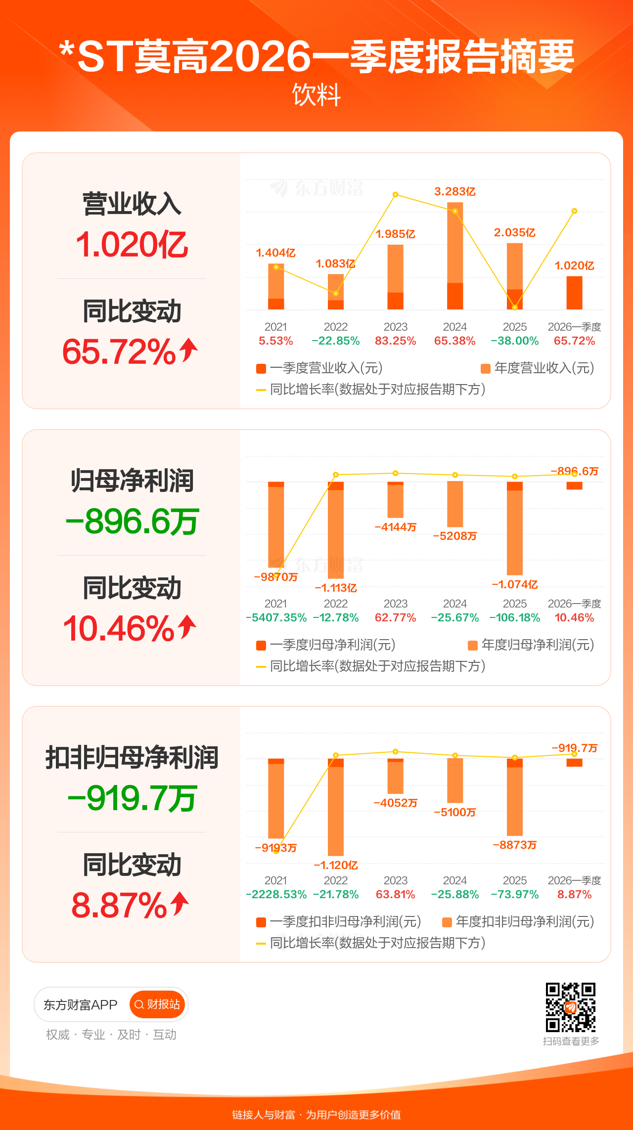 *ST莫高4月30日发布2026年一季报显示,公司一季度实现营业收入1.02亿元,同比增长65.72%;归母净利润-896.57万元;扣非归母净利润-919.70万元。