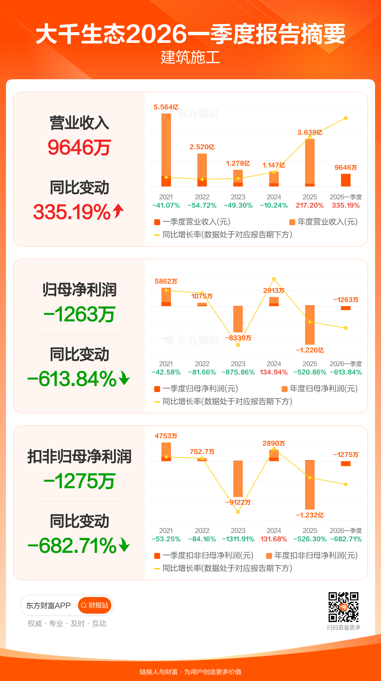 大千生态4月30日发布2026年一季报显示,公司一季度实现营业收入9646.06万元,同比增长335.19%;归母净利润-1263.27万元;扣非归母净利润-1275.19万元。