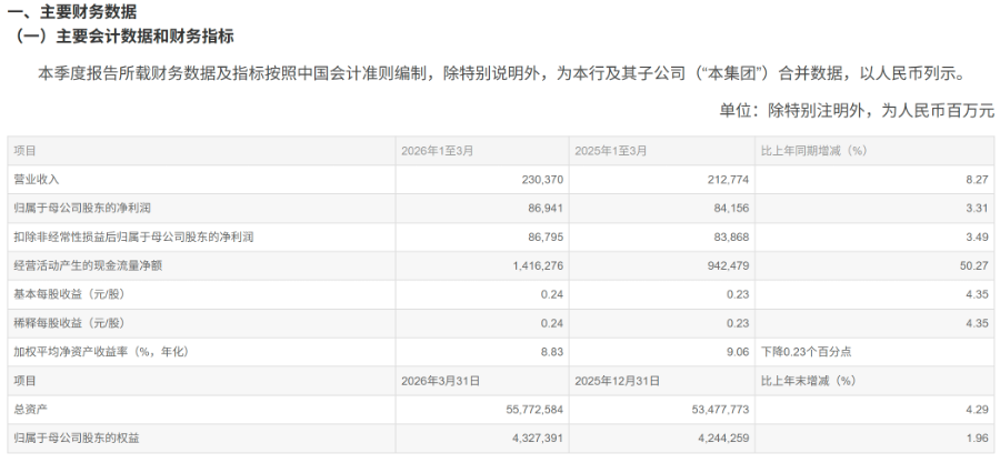 从财务基本面来看,2026年一季度工行实现营业收入2303.70亿元,同比增长8.27%;实现归属于母公司股东的净利润869.41亿元,同比增长3.31%,盈利增长保持平稳态势。资产负债规模稳步扩张,截至一季度末,工行总资产达55.77万亿元,较上年末增长4.29%;客户贷款及垫款总额31.65万亿元,客户存款38.59万亿元,存贷规模有序增长,持续夯实经营底盘。