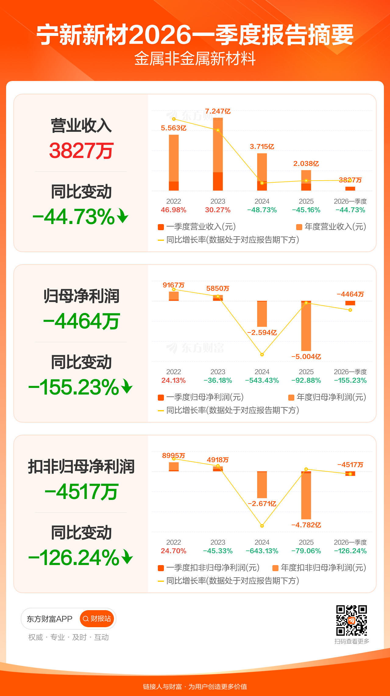 宁新新材4月29日发布2026年一季报显示,公司一季度实现营业收入3826.65万元,同比下滑44.73%;归母净利润-4463.94万元;扣非归母净利润-4516.51万元。