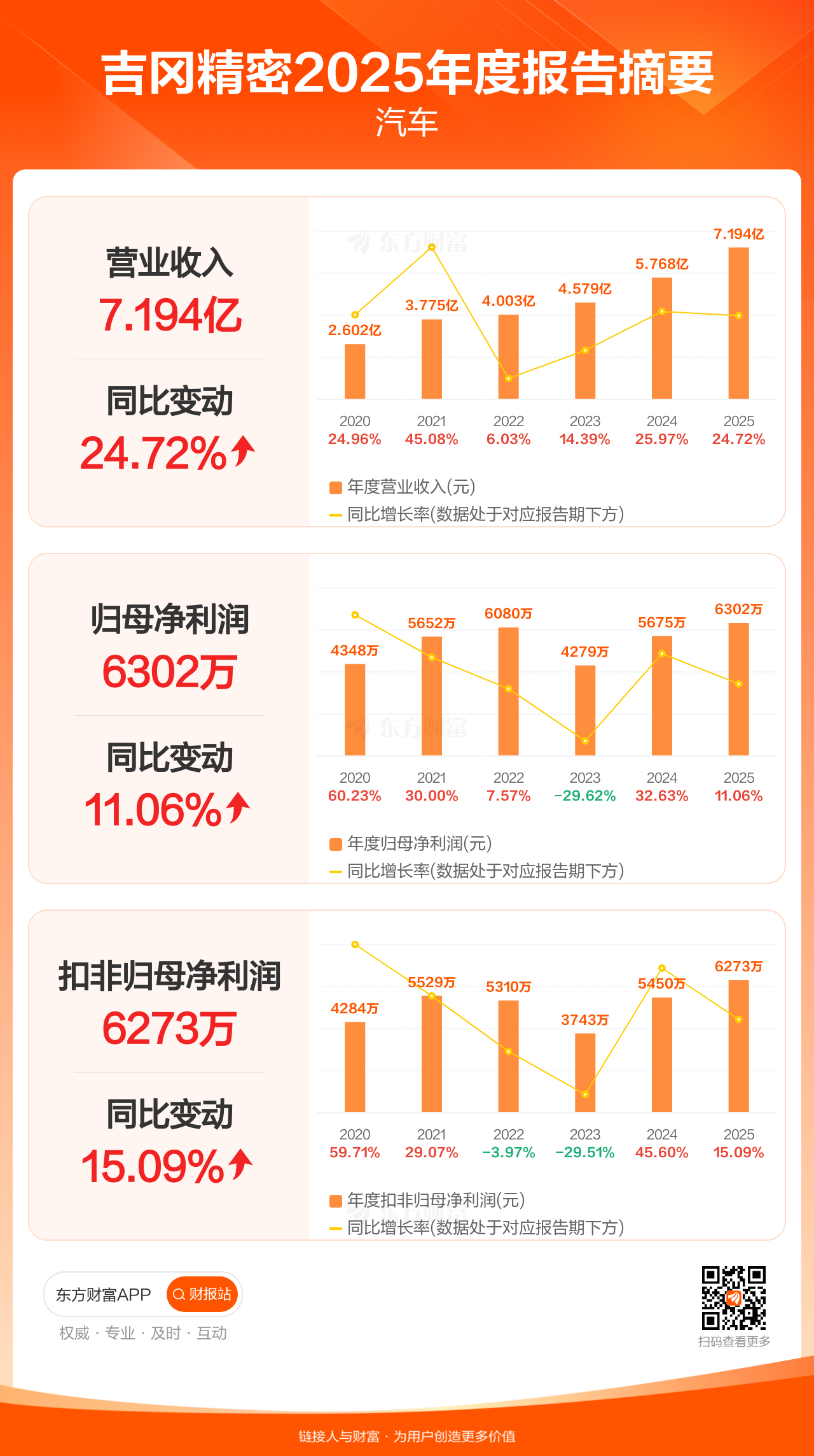 吉冈精密4月29日发布2025年年报显示,公司全年实现营业收入7.19亿元,同比增长24.72%;归母净利润6302.38万元,同比增长11.06%;扣非归母净利润6272.51万元,同比增长15.09%。