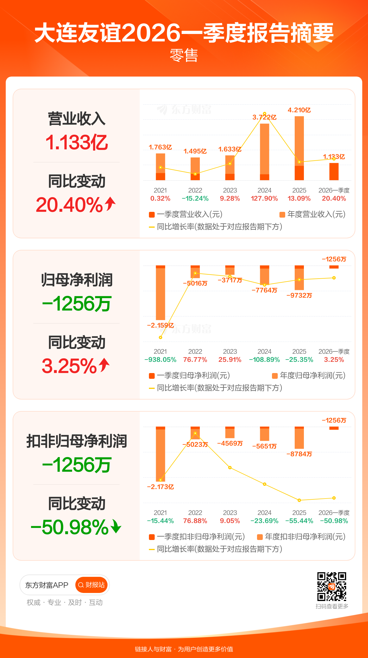 大连友谊4月30日发布2026年一季报显示,公司一季度实现营业收入1.13亿元,同比增长20.40%;归母净利润-1255.68万元;扣非归母净利润-1255.63万元。