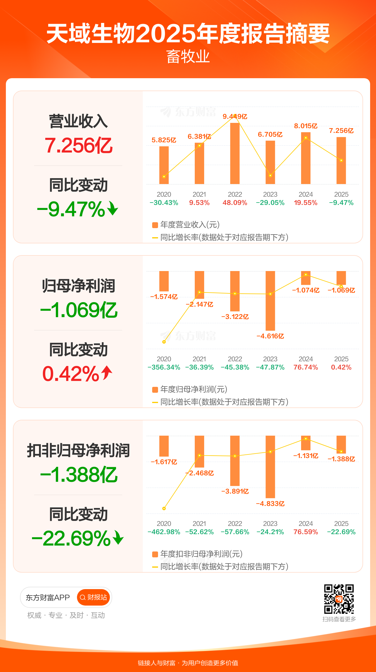 天域生物4月30日发布2025年年报显示,公司全年实现营业收入7.26亿元,同比下滑9.47%;归母净利润-1.07亿元;扣非归母净利润-1.39亿元。