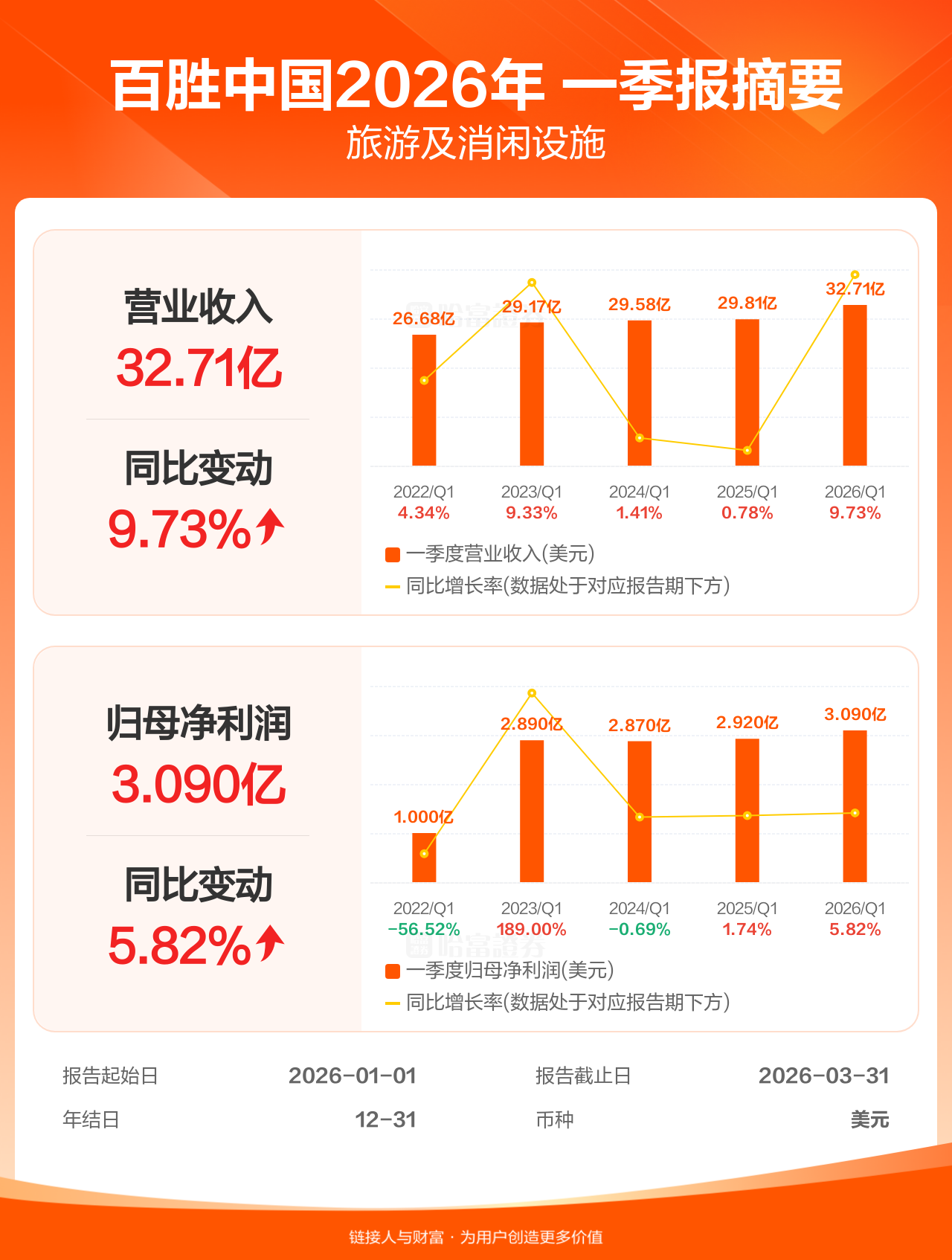 百胜中国4月29日发布一季报业绩,截至2026年3月31日的3个月内,该公司营业收入32.71亿美元,同比增长9.73%;公司权益持有人应占溢利(归母净利润)3.09亿美元,同比增长5.82%。