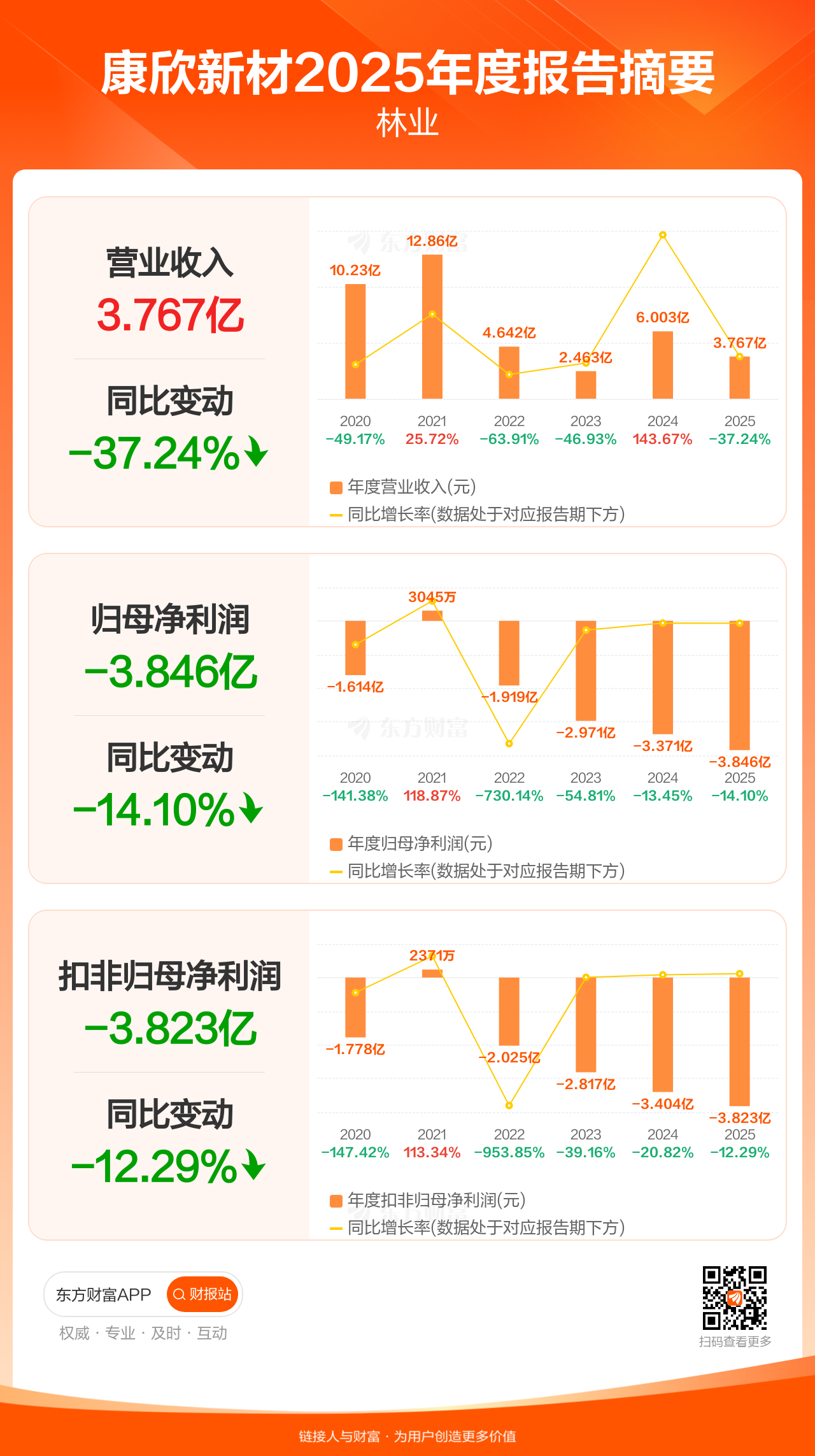 康欣新材4月30日发布2025年年报显示,公司全年实现营业收入3.77亿元,同比下滑37.24%;归母净利润-3.85亿元;扣非归母净利润-3.82亿元。