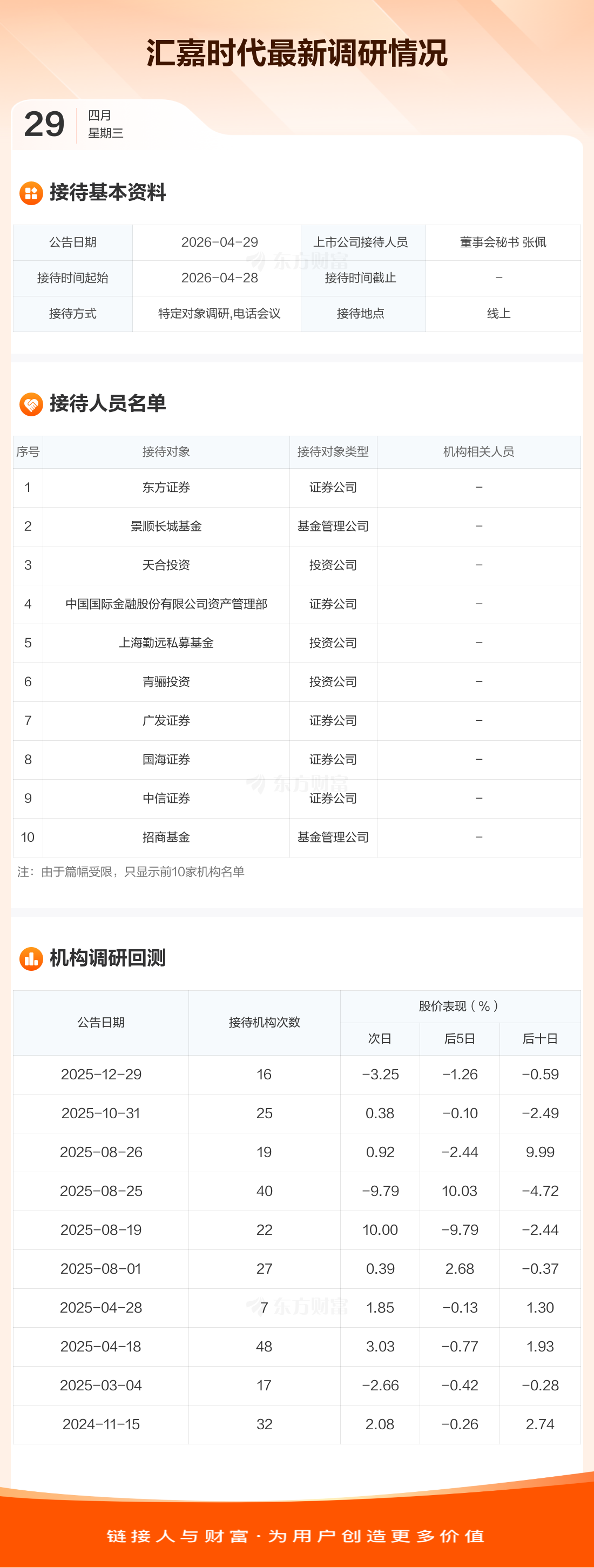 汇嘉时代4月29日公告称,4月28日接待东方证券等14家机构调研。接待人员包括董事会秘书 张佩。