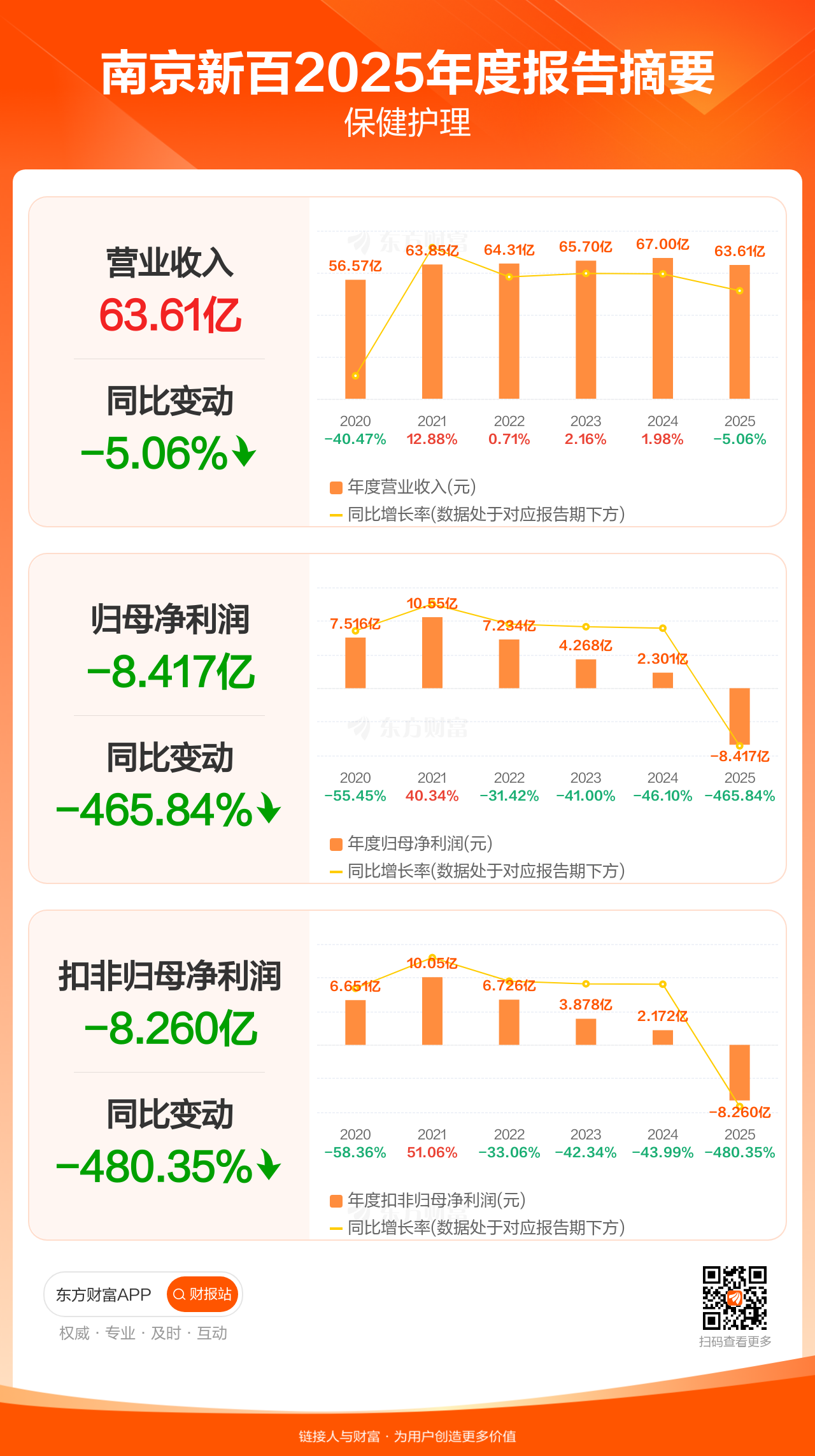 南京新百4月30日发布2025年年报显示,公司全年实现营业收入63.61亿元,同比下滑5.06%;归母净利润-8.42亿元;扣非归母净利润-8.26亿元。