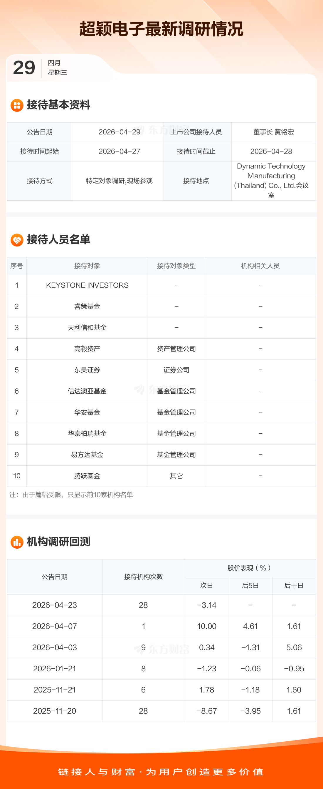 超颖电子4月29日公告称,4月27日至4月28日接待KEYSTONE INVESTORS等47家机构调研。接待人员包括董事长 黄铭宏。
