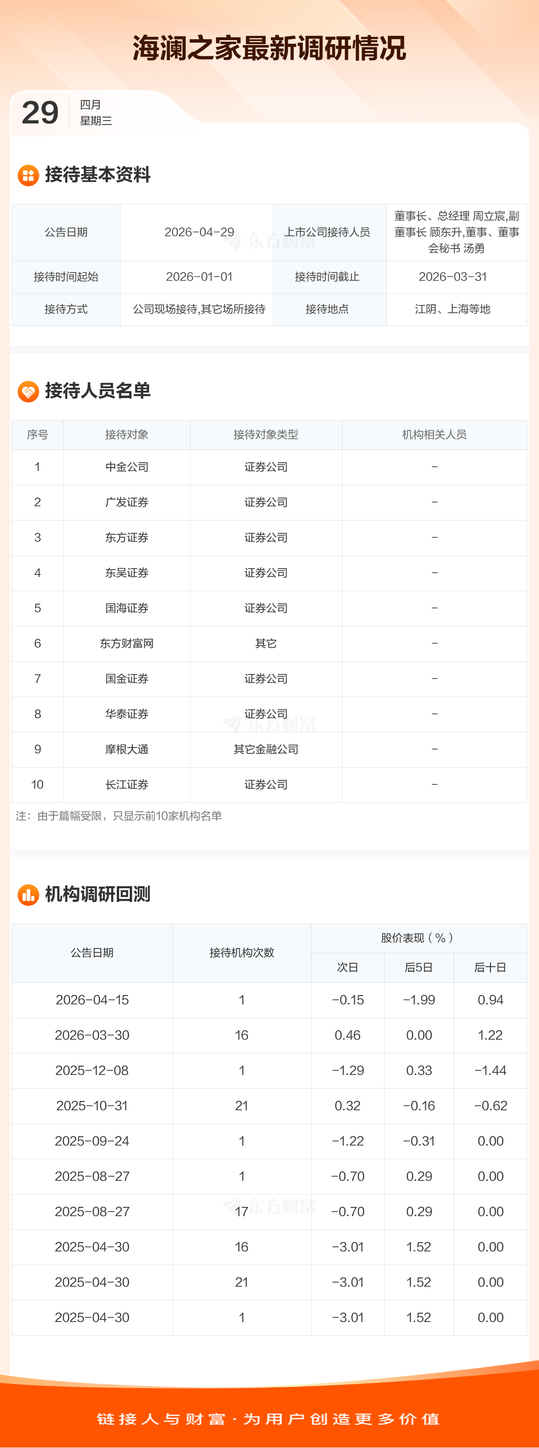 海澜之家4月29日公告称,1月1日至3月31日接待中金公司等17家机构调研。接待人员包括董事长、总经理 周立宸,副董事长 顾东升,董事、董事会秘书 汤勇。