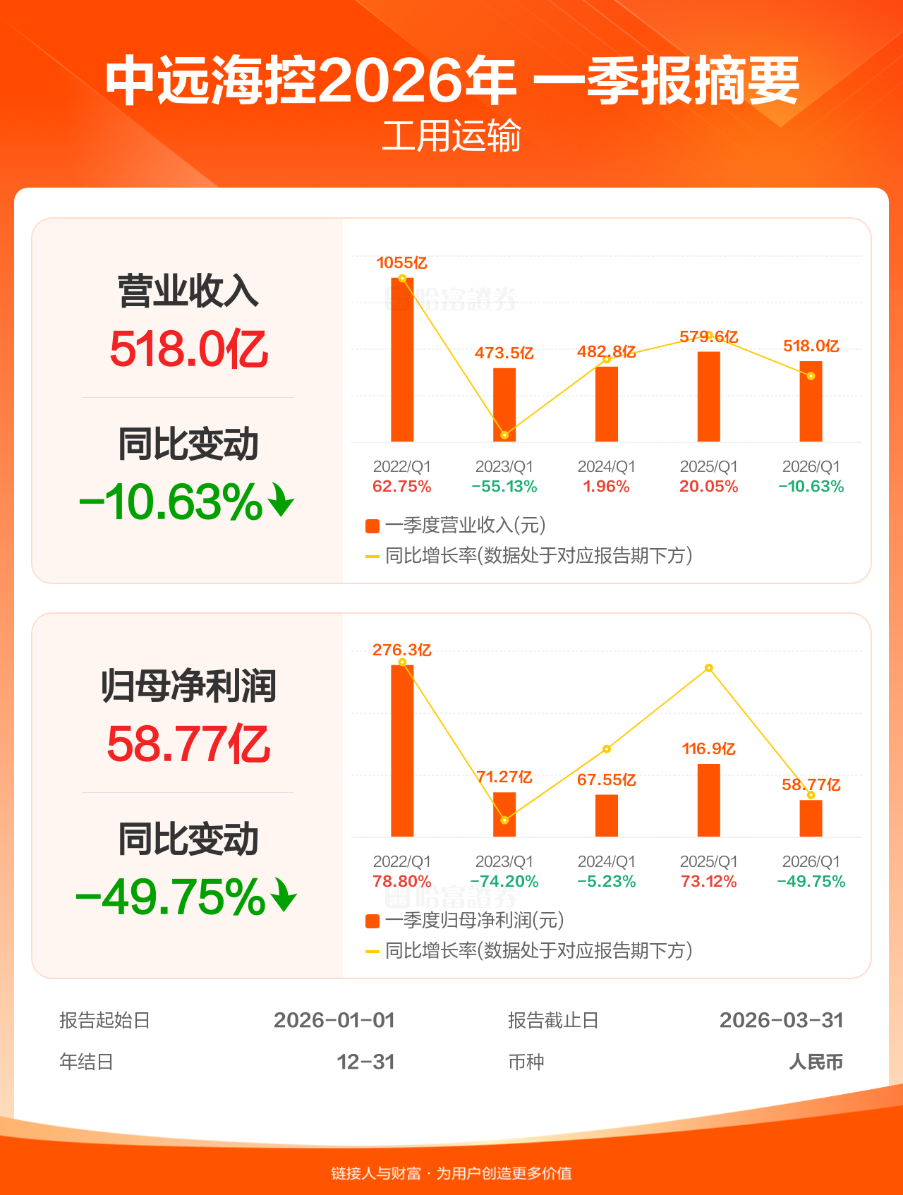 中远海控4月29日发布一季报业绩,截至2026年3月31日的3个月内,该公司营业收入517.97亿人民币,同比减少10.63%;公司权益持有人应占溢利(归母净利润)58.77亿人民币,同比减少49.75%。