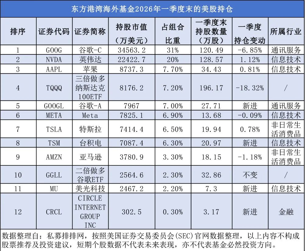私募排排网统计数据显示,截至2026年一季度末,东方港湾旗下的海外基金共持有12只美股标的,持股市值合计11.33亿美元,折合人民币约78亿元,相比2025年末约13.16亿美元的持股市值略有下降。从调仓动作来看,东方港湾旗下海外基金钟爱科技股,一季度加仓了英伟达和谷歌,并新进买入存储龙头标的。在业内人士看来,伴随着市场对地缘政治变化逐步脱敏,景气度向上且逐步兑现业绩的科技板块仍将是结构性行情的重要主线之一。