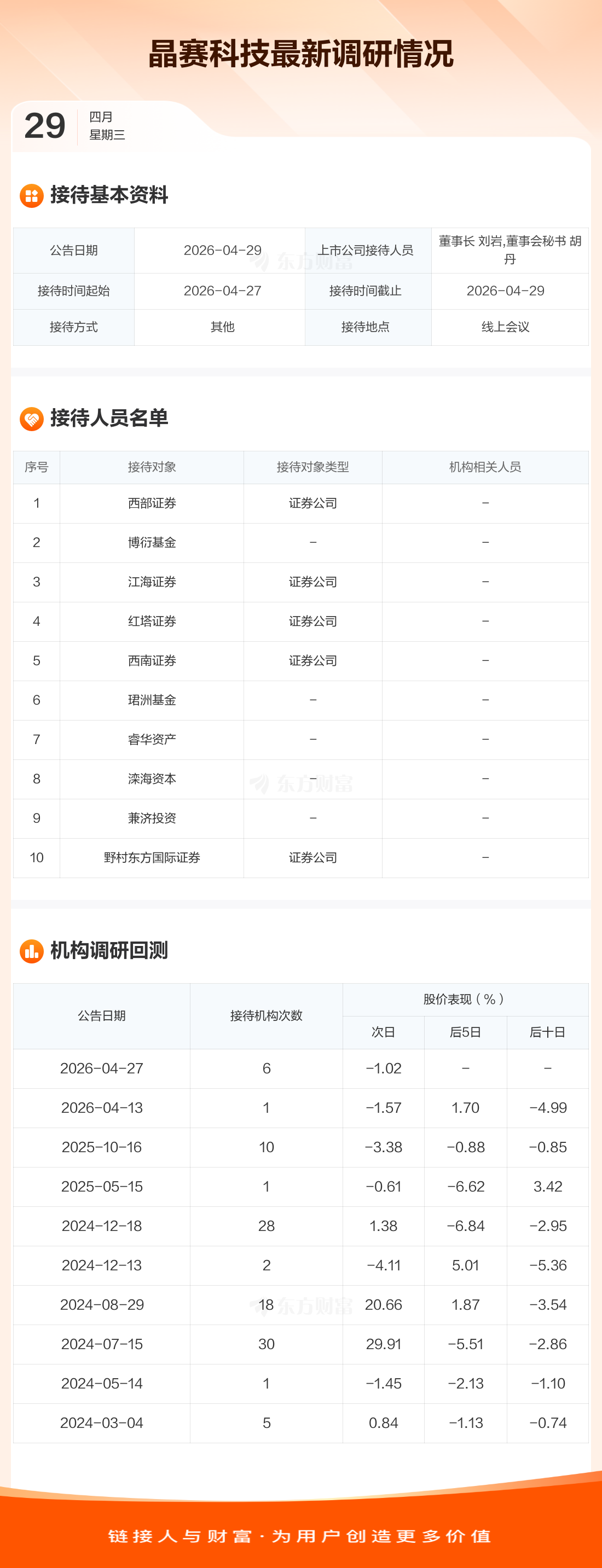 晶赛科技4月29日公告称,4月27日至4月29日接待西部证券等10家机构调研。接待人员包括董事长 刘岩,董事会秘书 胡丹。
