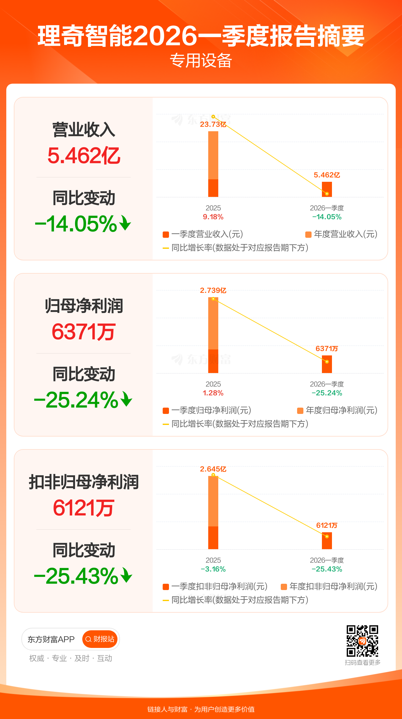 理奇智能4月10日发布2026年一季报显示,公司一季度实现营业收入5.46亿元,同比下滑14.05%;归母净利润6371.35万元,同比下滑25.24%;扣非归母净利润6121.48万元,同比下滑25.43%。