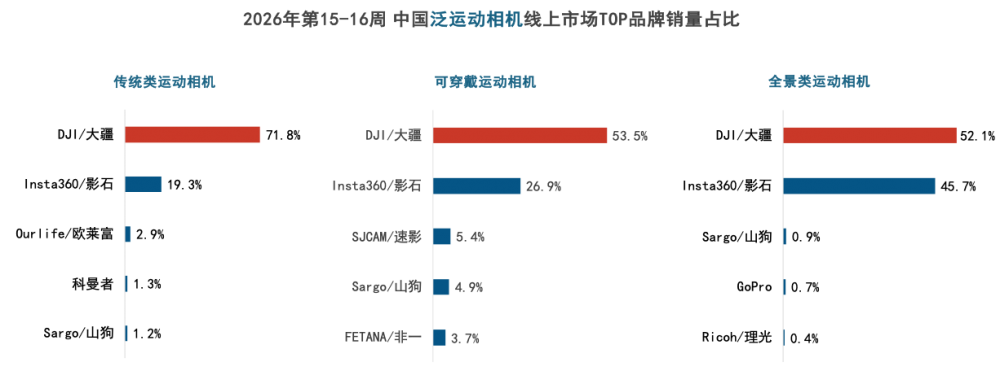这股强劲势头,也体现在泛运动相机领域。根据洛图科技发布的《中国运动相机线上零售市场周度追踪》报告,2026年第15-16周(2026.04.06-2026.04.19)最新双周,大疆在该领域以66.2%的合计销量份额位居第一,展现了无可争议的领导地位。