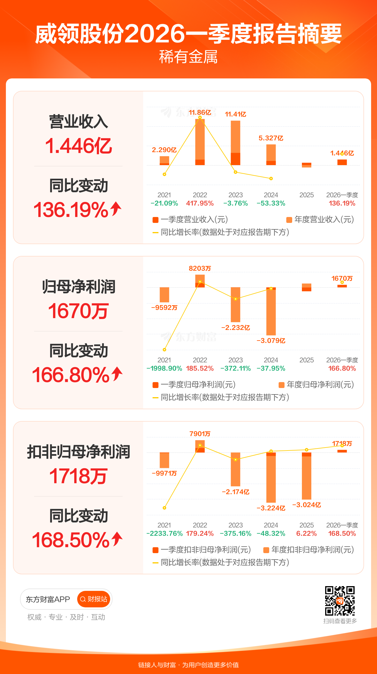威领股份4月30日发布2026年一季报显示,公司一季度实现营业收入1.45亿元,同比增长136.19%;归母净利润1669.53万元,同比增长166.80%;扣非归母净利润1718.05万元,同比增长168.50%。