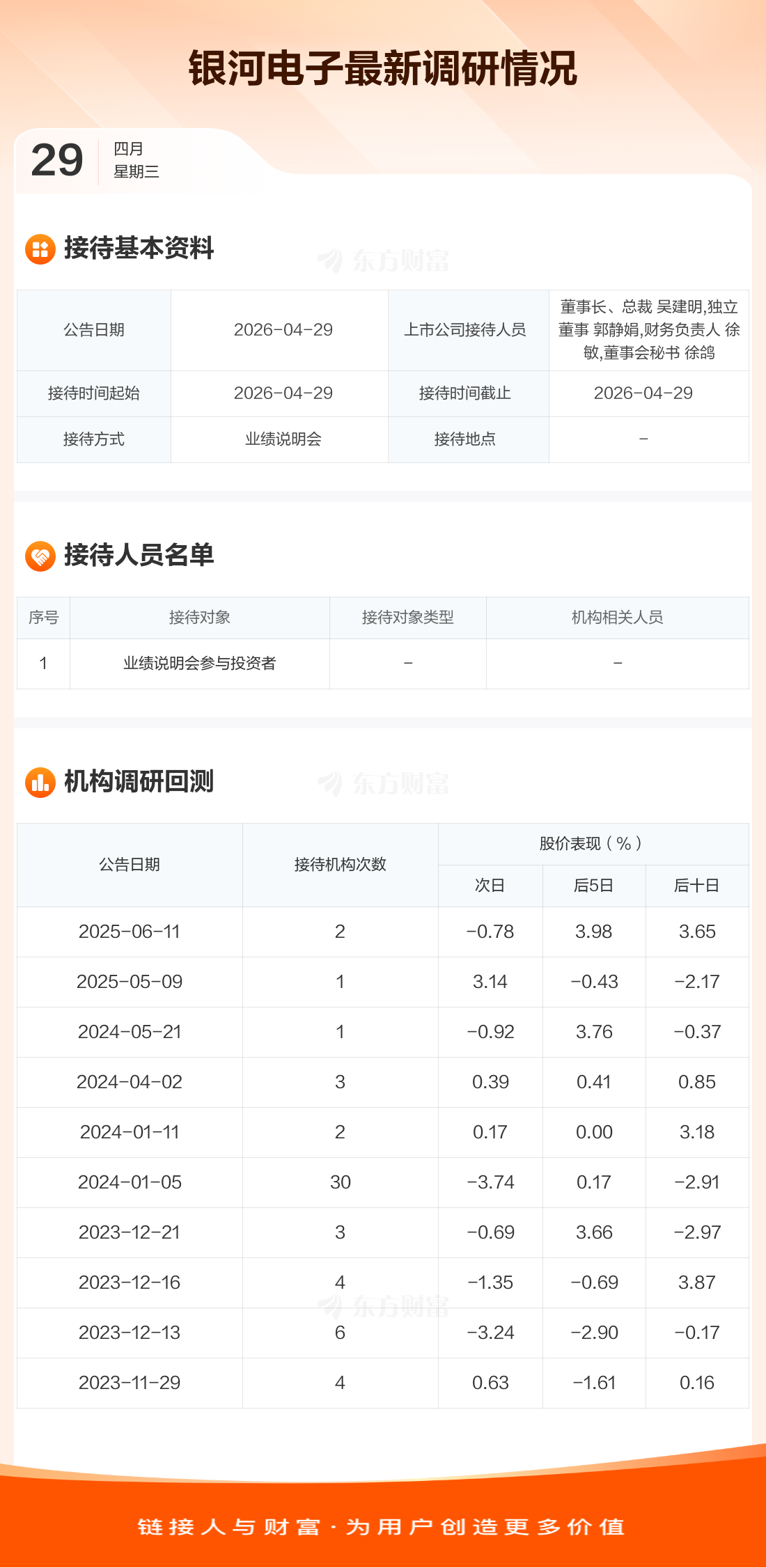 银河电子4月29日公告称,4月29日接待业绩说明会参与投资者调研。接待人员包括董事长、总裁 吴建明,独立董事 郭静娟,财务负责人 徐敏,董事会秘书 徐鸽。