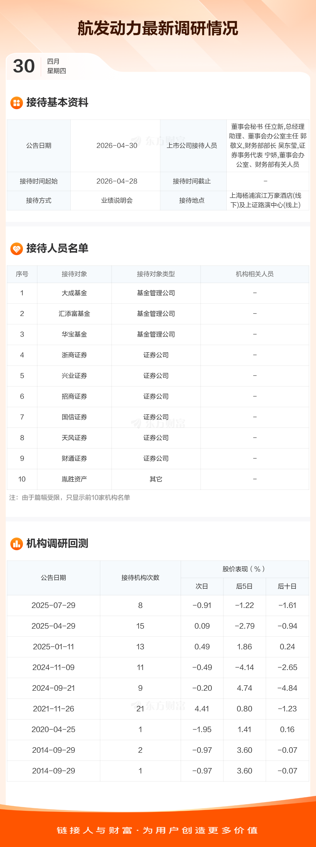 航发动力4月30日公告称,4月28日接待大成基金等20家机构调研。接待人员包括董事会秘书 任立新,总经理助理、董事会办公室主任 郭敬义,财务部部长 吴东莹,证券事务代表 宁娇,董事会办公室、财务部有关人员。
