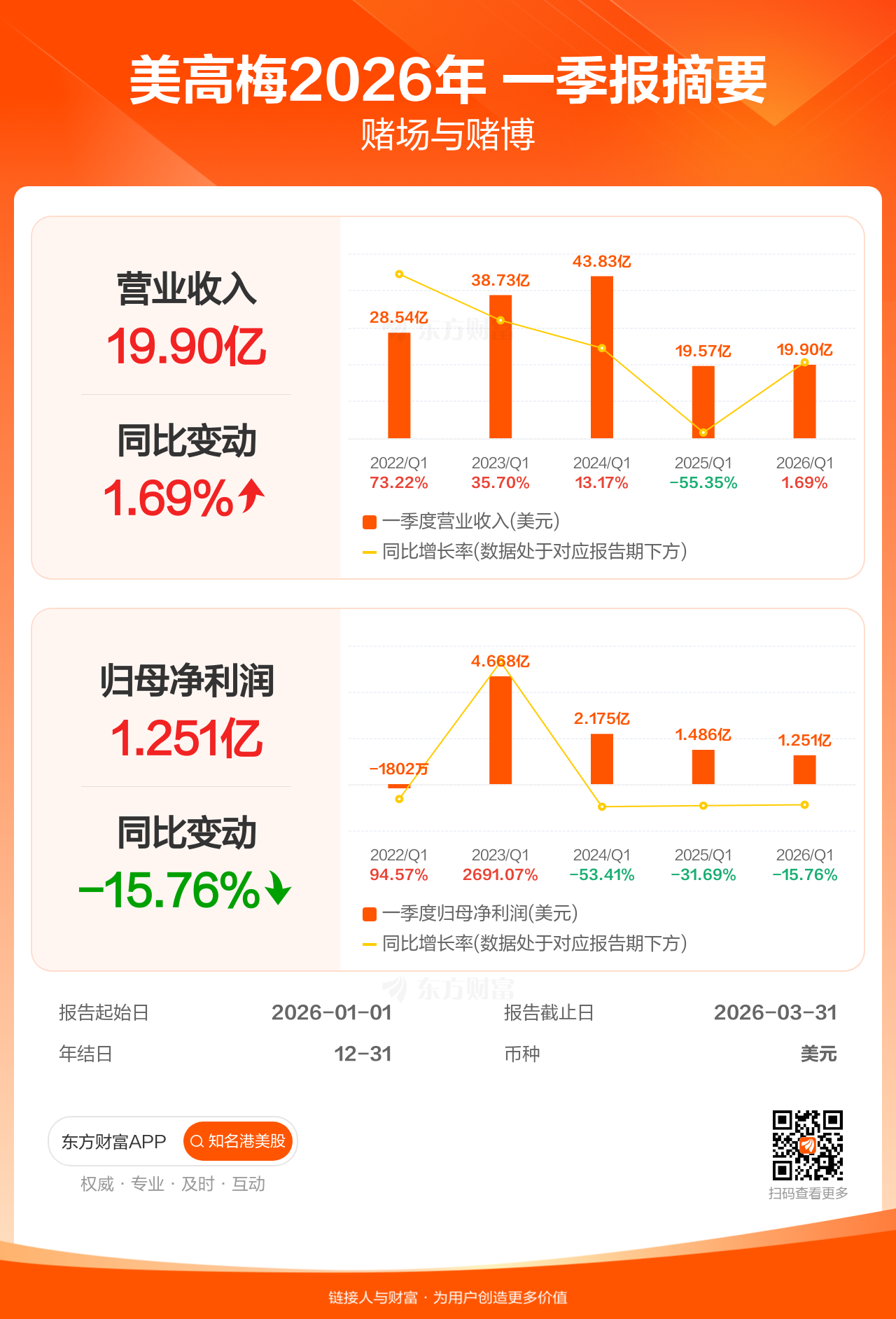 美高梅4月29日发布一季报业绩,截至2026年3月31日的3个月内,该公司营业收入19.90亿美元,同比增长1.69%;公司权益持有人应占溢利(归母净利润)1.25亿美元,同比减少15.76%。