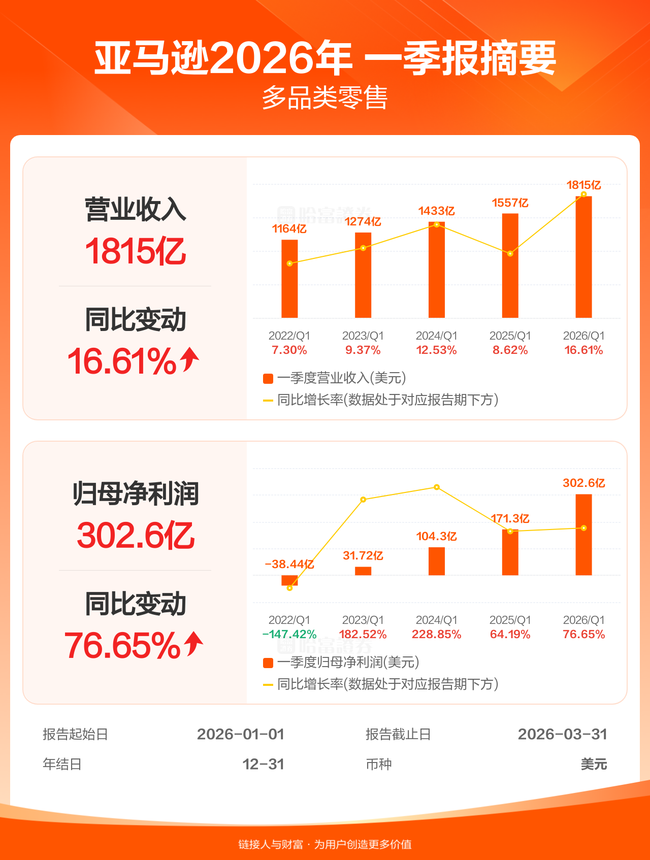 亚马逊4月29日发布一季报业绩,截至2026年3月31日的3个月内,该公司营业收入1815.19亿美元,同比增长16.61%;公司权益持有人应占溢利(归母净利润)302.55亿美元,同比增长76.65%。