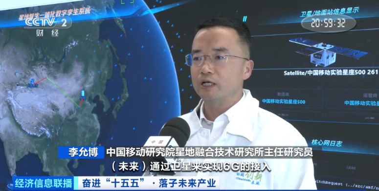 中国移动研究院星地融合技术研究所主任研究员李允博:我们已经发射两颗卫星作为试验星,未来通过卫星来实现6G的接入,就是要做现有5G网络不能覆盖的盲区,包括海洋、荒漠等场景。