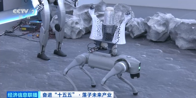 总台央视记者宁坤:这个场景模拟的是未来我们在月球表面建设基地时,不同类型的智能机器人利用6G网络去进行自主协同作业的现场。模拟的是管道出现破损的情况,很快四足机器狗就运输着相应的物料到了现场,交给旁边的双足机器人进行维修作业。显示的整体网络上行速率已经超过了每秒100兆。即使单个机器人所使用到的上行传输速率,也要比目前5G网络环境下单个用户使用的上行传输速率高出5到10倍左右。
