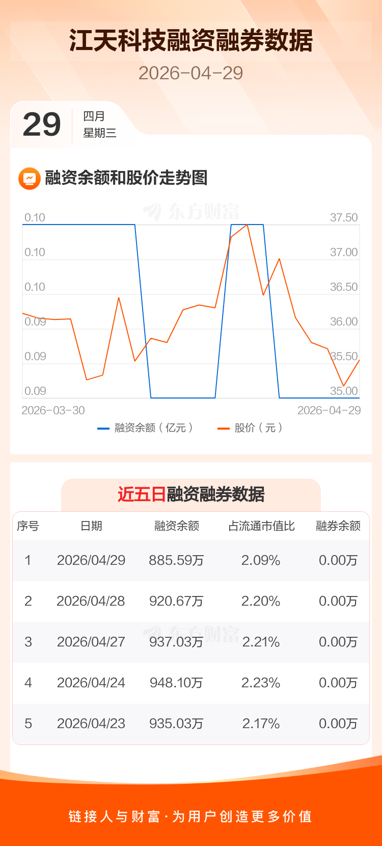 交易所最新数据显示,江天科技于2026年4月29日获融资买入6.97万元,融资偿还42.06万元,当日融资净偿还35.08万元。目前,该股融资余额885.59万,占流通市值比例为2.09%。