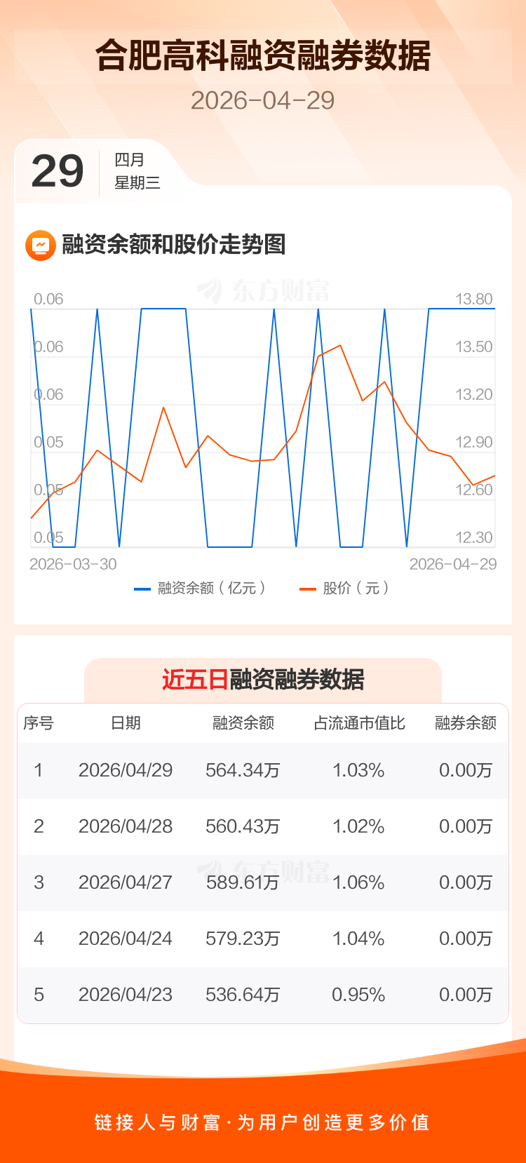 交易所最新数据显示,合肥高科于2026年4月29日获融资买入30.94万元,融资偿还27.03万元,当日融资净买入3.91万元。目前,该股融资余额564.34万,占流通市值比例为1.03%。