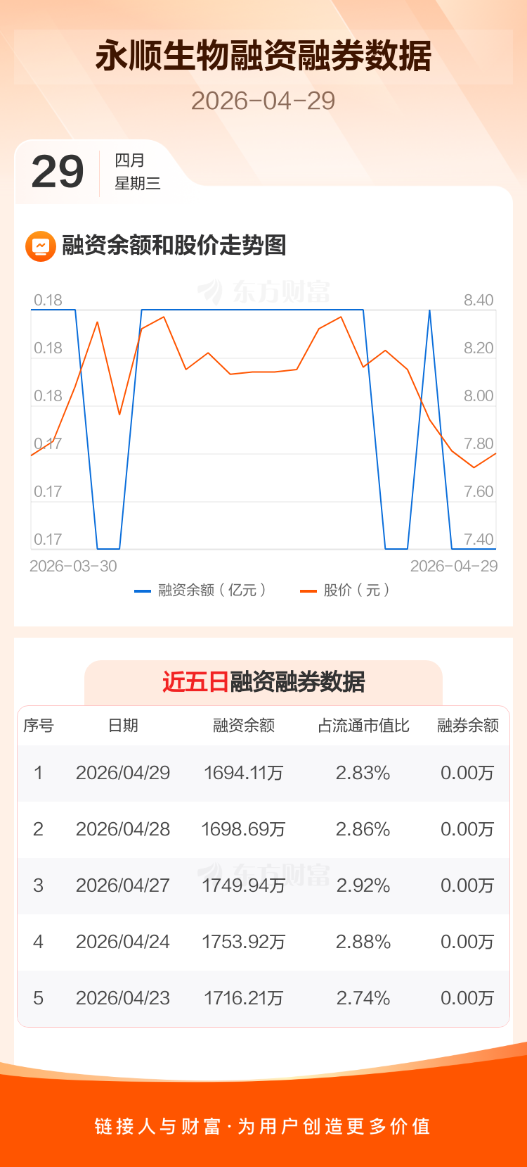 交易所最新数据显示,永顺生物于2026年4月29日获融资买入41.19万元,融资偿还45.77万元,当日融资净偿还4.58万元。目前,该股融资余额1694.11万,占流通市值比例为2.83%。