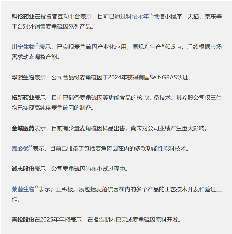 从上市公司来看,多家公司已明确布局麦角硫因市场,如科伦药业、川宁生物、华熙生物、拓新药业、金城医药、嘉必优、诚志股份、莱茵生物、青松股份。