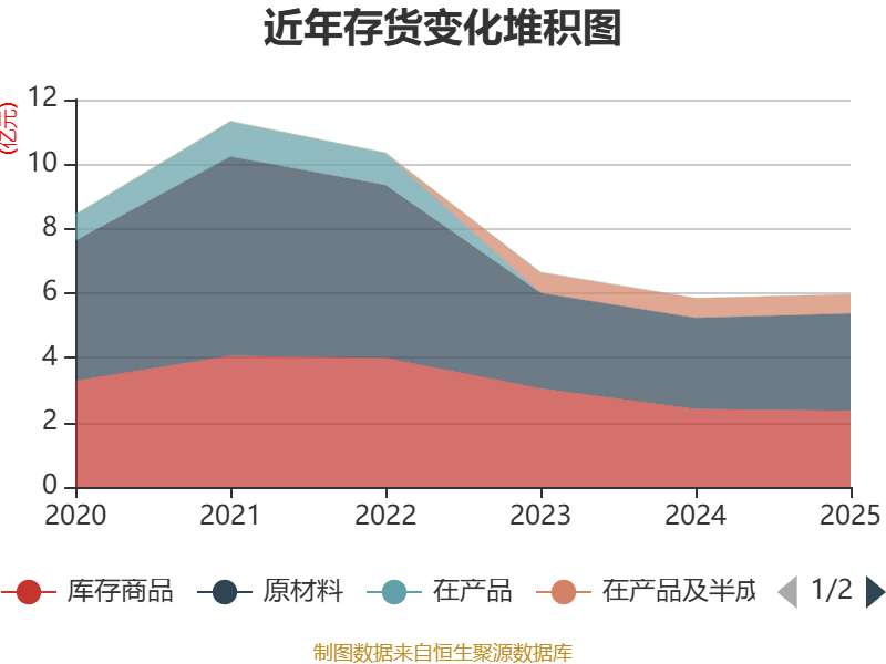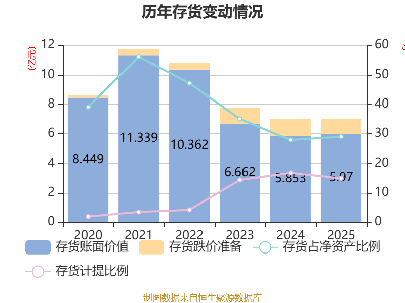 从存货变动来看,截至2025年末,公司存货账面价值为5.97亿元,占净资产的29.01%,较上年末增加1172.15万元。其中,存货跌价准备为1.04亿元,计提比例为14.88%。