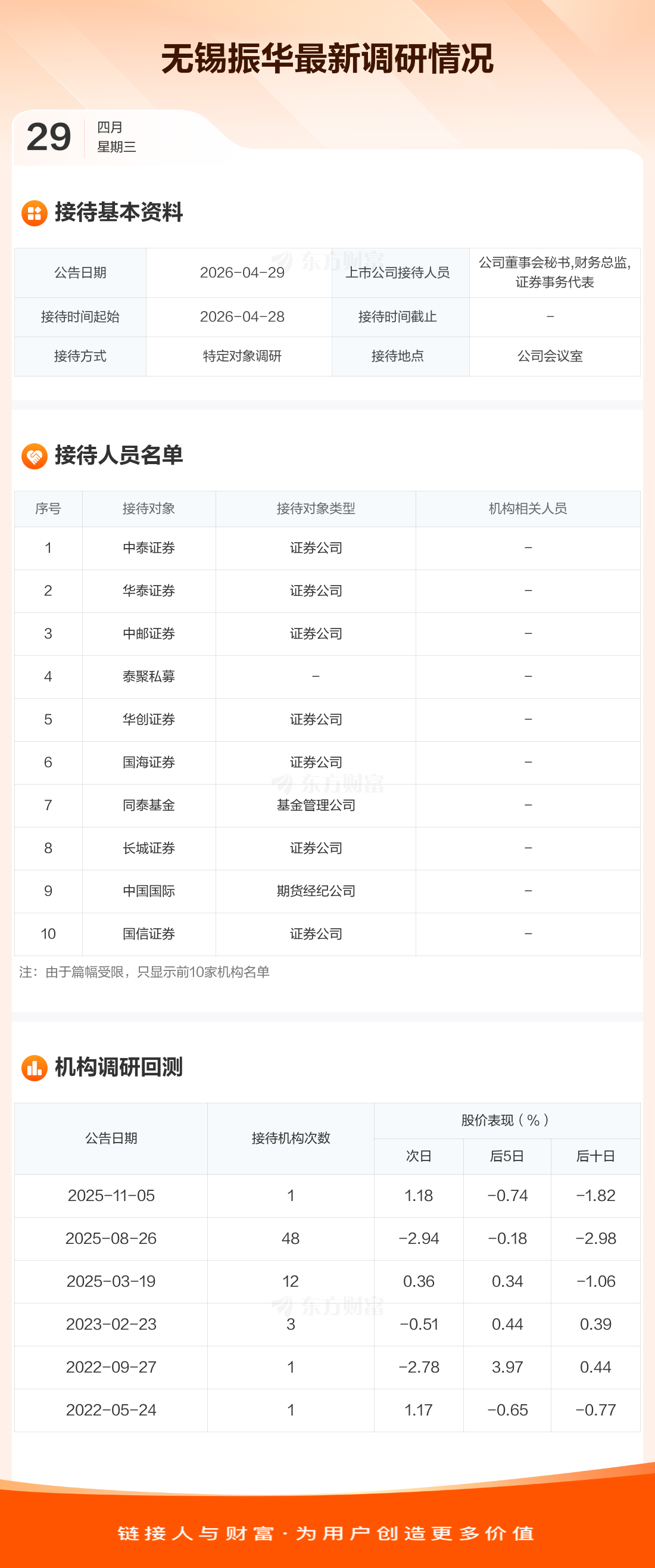 无锡振华4月29日公告称,4月28日接待中泰证券等13家机构调研。接待人员包括公司董事会秘书,财务总监,证券事务代表。
